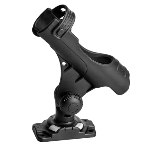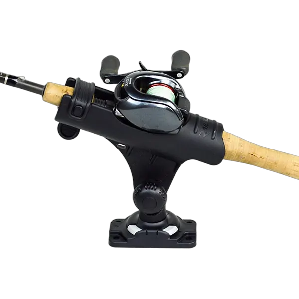 The RAILBLAZA Rod Holder R is the little brother to the Rod Holder II. It is designed for holding fishing rods with spinning , baitcaster or fly reels. To secure your rod the stretchable strap at the front of the holder will wrap around the top for baitcaster and fly reels and round the bottom for spinning reels. The Rod Holder R is a light duty rod holder suitable for fresh water and in shore fishing. It is not designed for trolling. If you need a Rod Holder for trolling check out our Rod Holder ll. The Rod Holder R is available either as a kit complete with a StarPort HD, or as a rod holder by itself. Always use a leash.