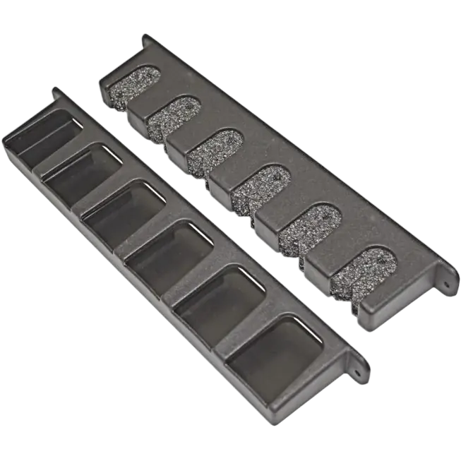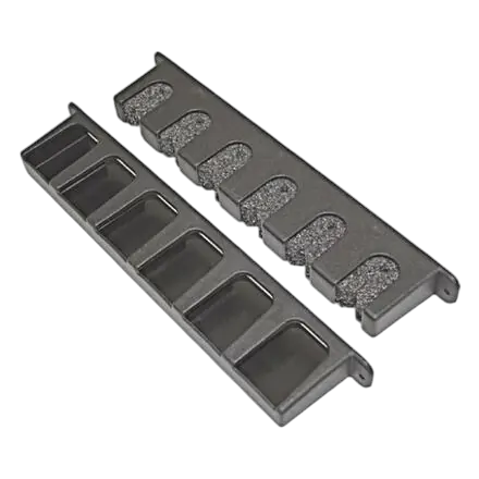 Closed cell foam structure supports rods securely without damage. Plastic housings can be secured to any surface. Vertical rod holder has dished base to support butt of rods. Black coloured frame. 4 x mounting screws supplied. 310mm L x 30mm W x 60mm H Hang packed in sets. Stores 6 fishing rods.