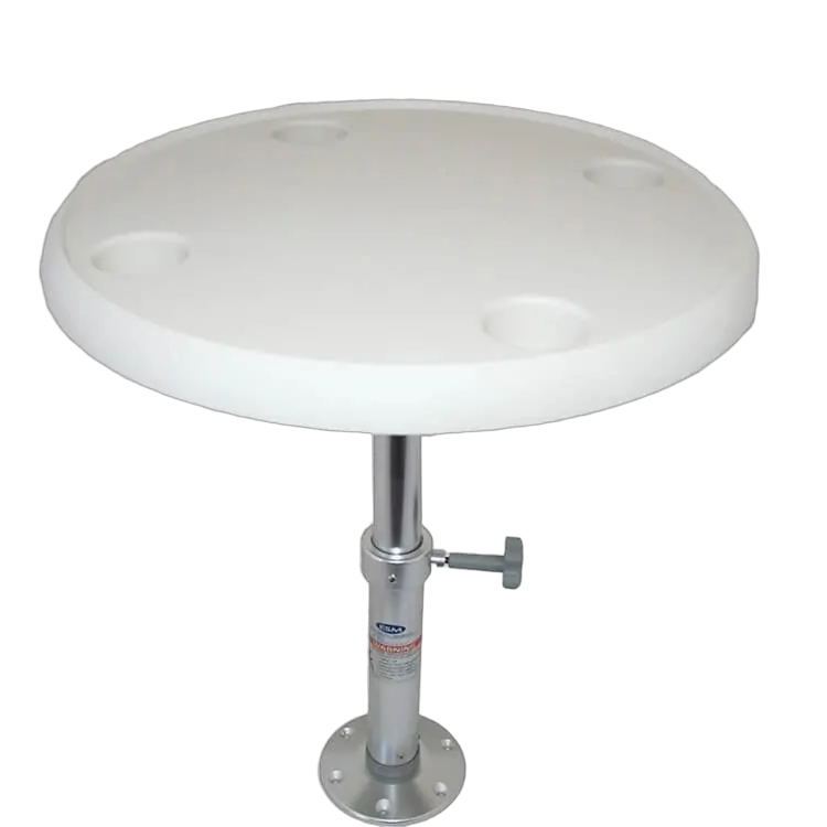 Table and pedestal complete packaged sets available with oval or round table and fi xed or adjustable length pedestal. The thread-lock pedestal system allows the table and pedestal pole to be quickly and easily removed from the base for storage. The thread lock also includes a ratchet lock mechanism for very steady and secure mounting.