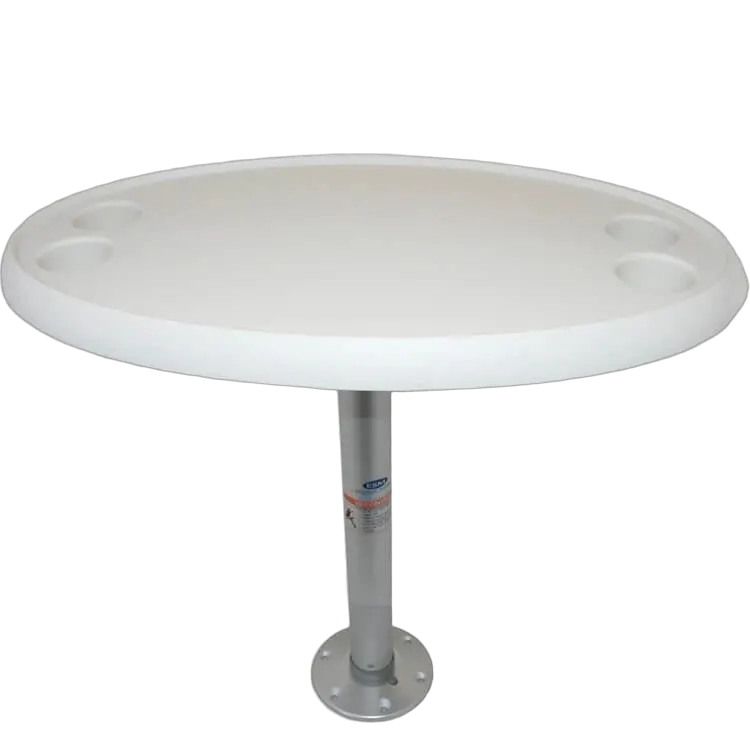 Table and pedestal complete packaged sets available with oval or round table and fi xed or adjustable length pedestal. The thread-lock pedestal system allows the table and pedestal pole to be quickly and easily removed from the base for storage. The thread lock also includes a ratchet lock mechanism for very steady and secure mounting.