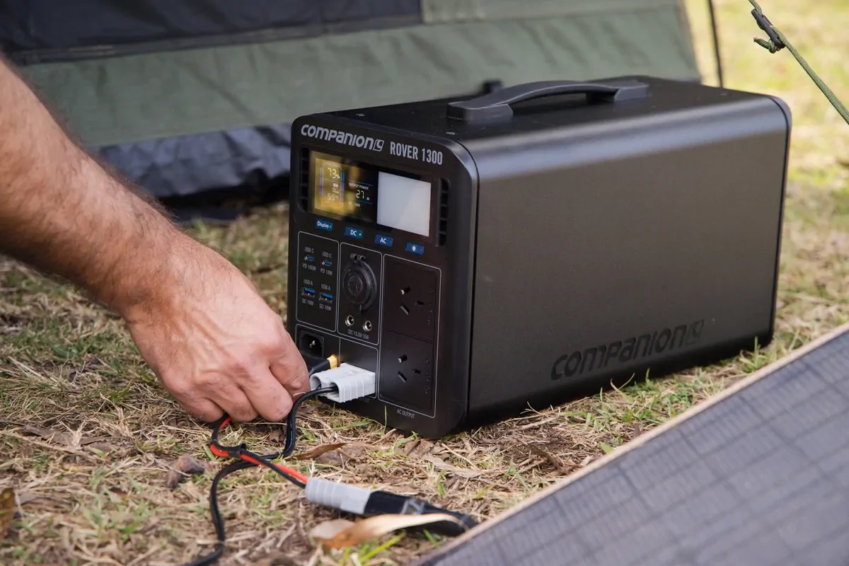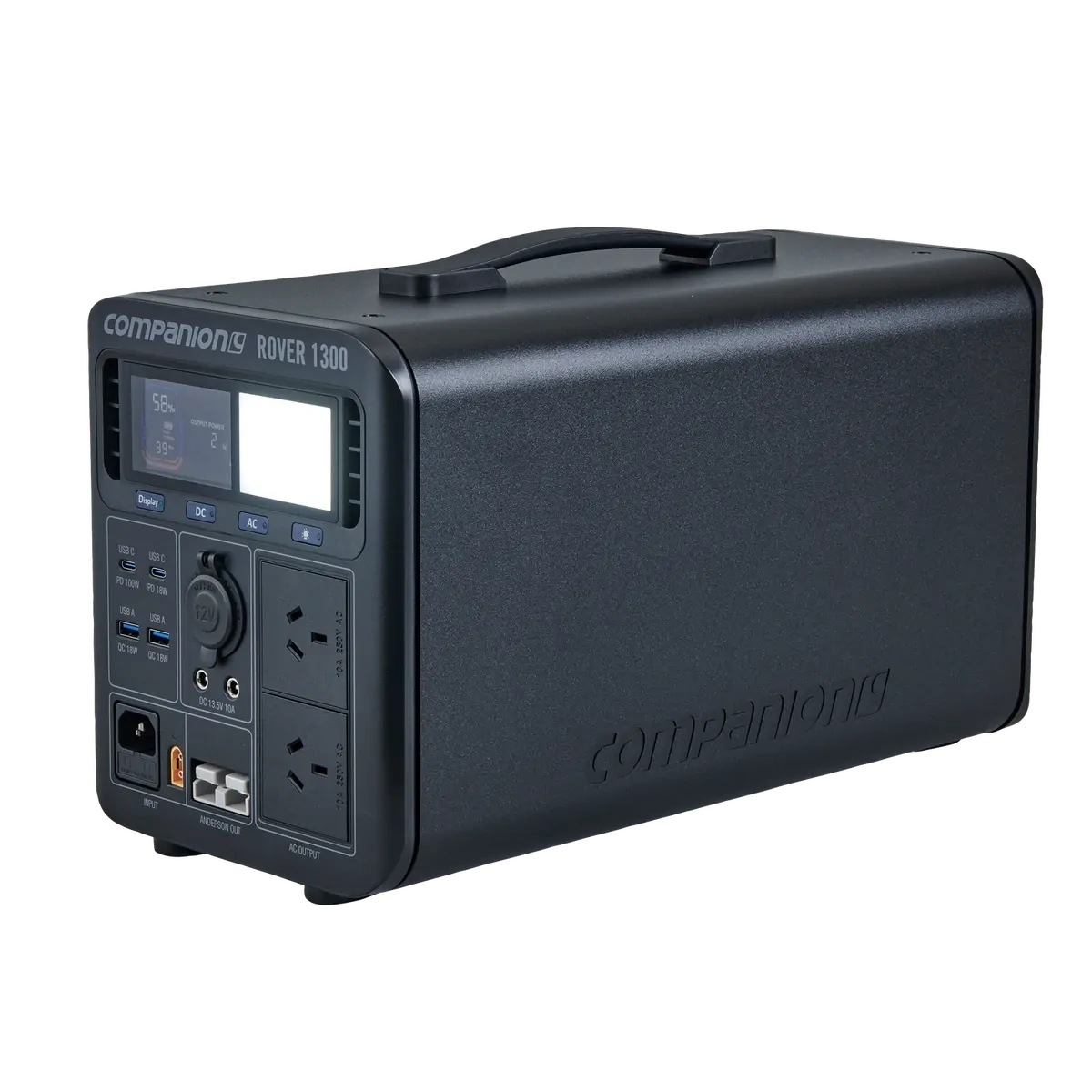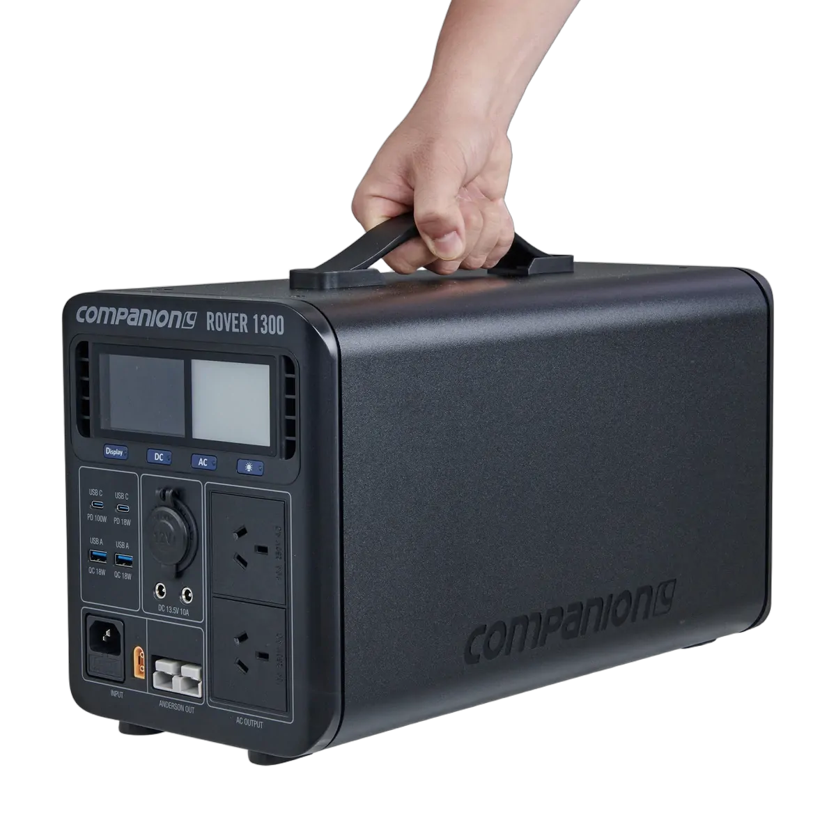 The Rover 1300 is Companion’s most powerful and feature packed powerstation. This is your ideal, portable indoor or outdoor power solution and is capable of following you anywhere you need fast, reliable power and lots of it! Powered by a lithium LiFePo4 battery, the Rover 1300 delivers an enormous 1344Wh or 105Ah (@12.8V). With a total of 10 outputs including Anderson and 2 independent AC ports, you can power almost any device and multiple devices at the same time. The bi-directional 1200W inverter delivers lightning fast charging with 90 minutes to 80% capacity and 2.2 hours to 100%. The on board Battery Management System (BMS) ensures optimum operation while the built-in MPPT controller allowing for direct connection to solar (up to 400W) for charging. The full colour, smart display tells you everything you need to know from charge status, to capacity output and estimated run time based on current usage. All of this and the Rover 1300 is backed by a 2-year warranty.