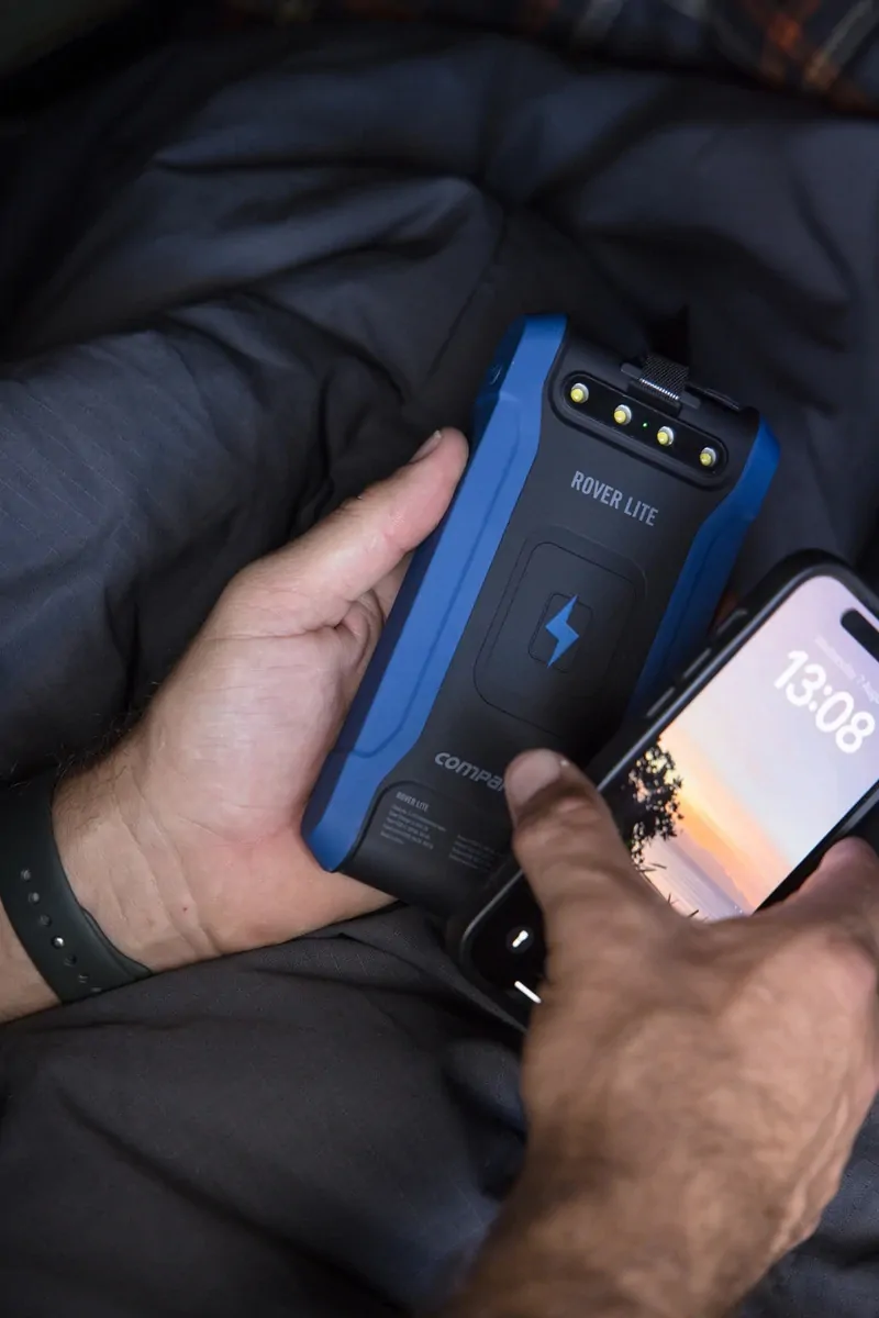 The Rover Lite Powerbank packs 20,000 mAh, enough to charge phones multiple times. It supports USB-A, USB-C, and wireless charging, with an LED display for battery status.