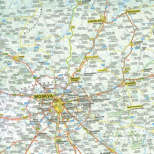 A country map of Russia that includes Ukraine and Belarus at a scale of 1:2,000,000. Also included is an overview map that includes Russia, Ukraine, Belarus, Armenia, Azerbaijan, Georgia, Kazakhstan, Kyrgyzstan, Moldova, Tajikistan, Turkmenistan and Uzbekistan. Marked on the map are national parks, points of interest and road distances, complementing city maps of Moscow, Kiev, Saint Petersburg and Minsk.