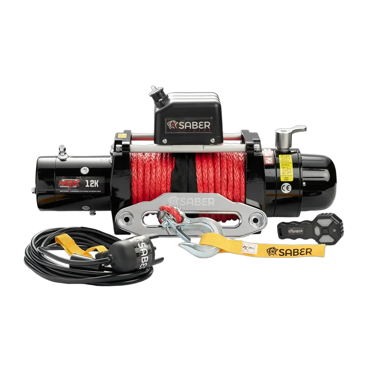 Saber Offroad HDX 12v Winch Key Features Superior 9 point 14mm pin locking mechanism in the rotating ring gear, compared to far smaller pins in other winches, allowing for simpler and easier clutch operation Automatic Double Cone Braking Mechanism – so once you have tension on the line, and cease winching, brake automatically applies itself. Once the brake is applied there is no possibility for the line to ‘run out’ and lose tension, resulting in much safer winching operations Include both our exclusively designed wireless hand controller, and a wired controller HDX series wound motor delivers superior torque whilst running fast line speeds Gear Ratios: 9500LBS: 173:1 & 12000LBS: 254:1 IP67 Rated Available in 9500lbs & 12000lbs capacity models Limited Lifetime Mechanical Warranty & 3 Year Electrical Warranty Water Ingress & Your Warranty Water ingress under normal winching conditions is covered by our warranty. This does not apply if the winch is used while submerged. The Saber Offroad HDX winch is not designed high-pressure cleaning equipment or prolonged total submersion.