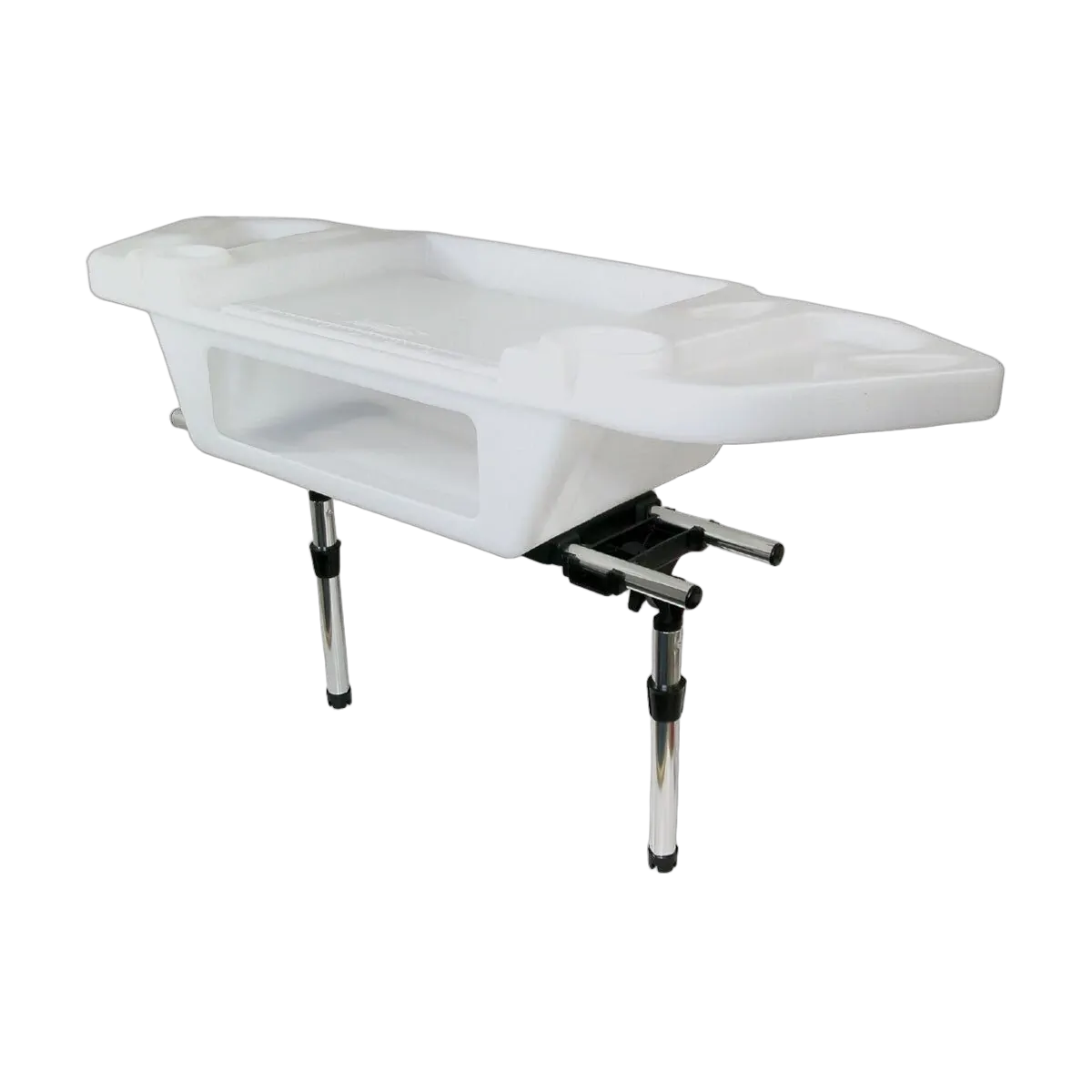 Convenient drop in/lift out mount into two existing fixed mount rod holders. Manufactured from super tough moulded U.V. stable, rotomoulded polyethylene, glass filled nylon and aluminium. Cutting surface resists cuts and abrasions whilst retaining knife edge. Features include fan pattern integral moulded rod holder slots, two drink holders and multiple storage recesses. 394860 includes a large storage compartment underneath the cutting surface of the board. Includes alloy legs.