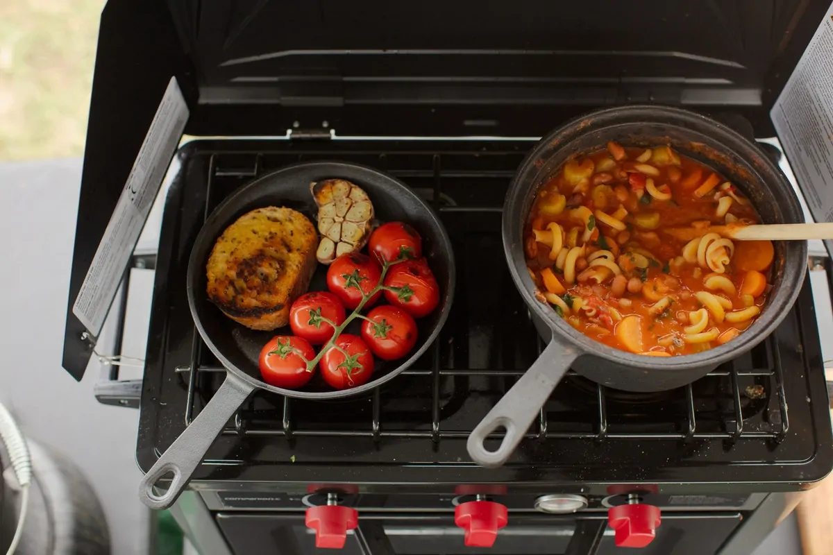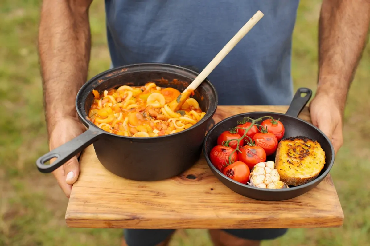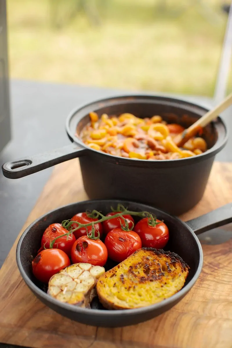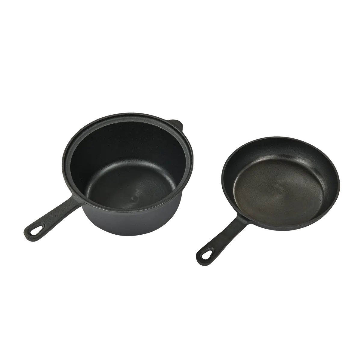 A versatile 2.3QT cast iron saucepan with a skillet lid, perfect for simmering sauces or searing food. Pre-seasoned and ready for use over a campfire.