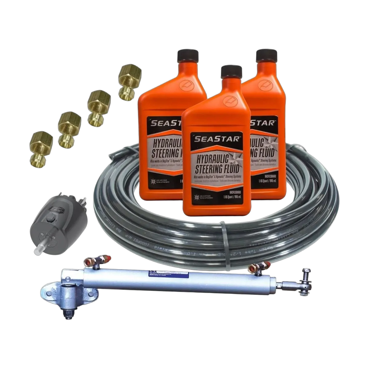 Splashwell Mount Steering Kit Inclusions 1 x 291008 Splashwell mount cylinder 1 x 291502 1 7 front mount helm 1 x 292997 15m nylon semi rigid tube 4 x 293610 Nut olive kit 3 x 291902 1 litre SeaStar Solutions oil Purchase the 291199 tie bar for dual engine installation