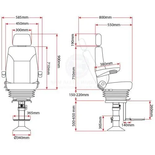 | The Relaxn Seafarer Seat is stylish with a sleek profile. Each Relaxn Seafarer Seat uses plush high-density foam cushions covered in premium grade vinyl. The high backrest, headrest, foot rest and armrests are all adjustable, giving complete customisation. Ergonomically designed to provide optimal posture, with lateral and lumbar support reducing fatigue and improving comfort. The suspension system absorbs wave impact and allows the seat to move with the occupant increasing stability and safety. Starting at the base, the aluminium pedestal assembly is height adjustable with a full-length foldable footrest and commercial slide and swivel with 360 Degree rotation. Each Relaxn Seafarer Seat is built to the toughest marine standards, using weather, water and corrosion-resistant material. Available in Black Carbon or custom options. • Plush high-density foam padding providing ultimate comfort. • Premium quality UV stabilised upholstery developed for the harsh marine environment. • Adjustable backrest, headrest, seat rest and armrests. • High back and contoured sides offer excellent support and comfort. • Full-length foldable footrest integrated into the seat base. • Height adjustable Air Ride Pedestal. • Robust reinforced frame. |