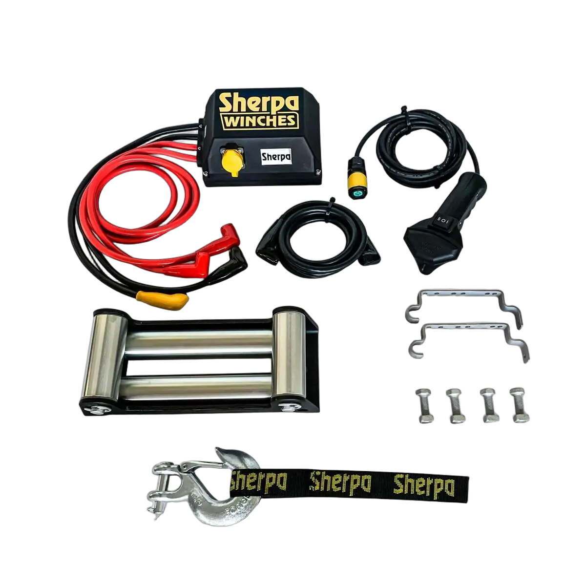 Sherpa winches are supplied as a kit with all the items required for a standard winch installation. See the images here showing the parts included for synthetic rope and steel cable models.