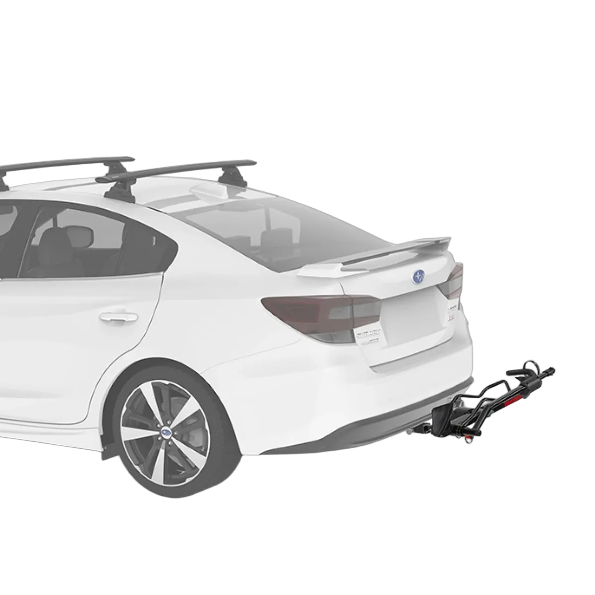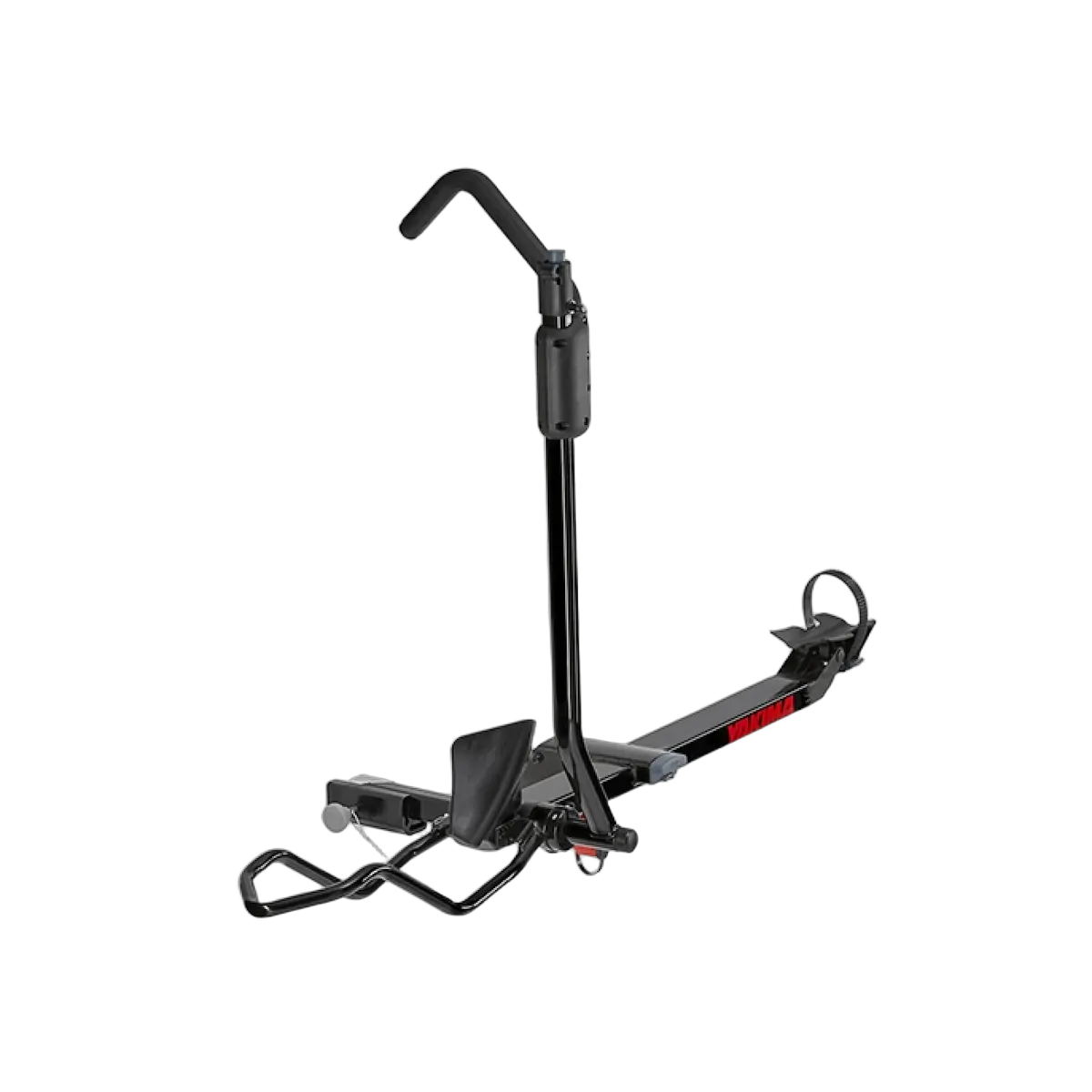 - Lightweight, hitch mounted tray rack that carries one bike without frame contact