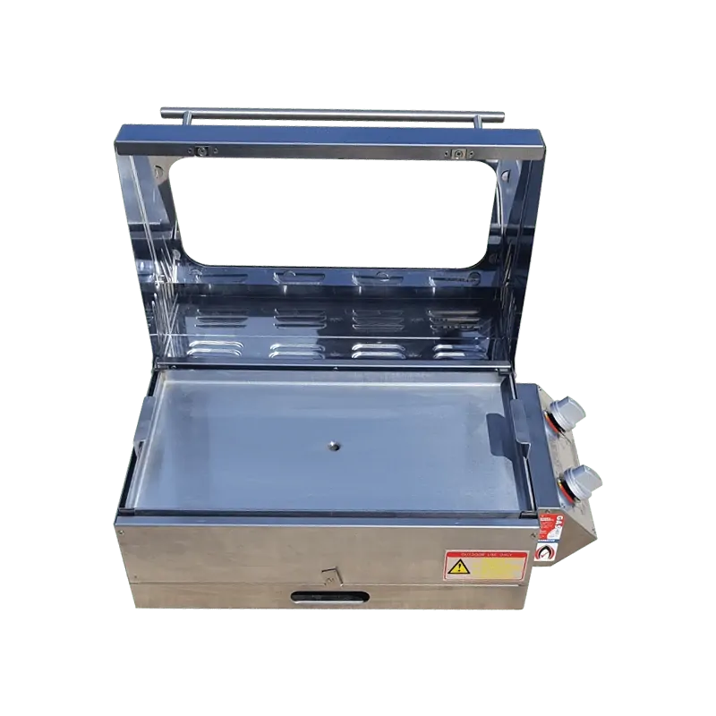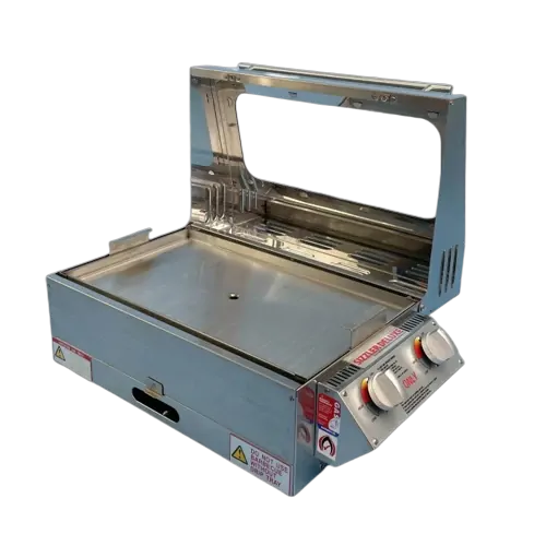 The Sizzler Deluxe High Lid comes standard with a solid stainless-steel hot plate, flame failure device fitted to each burner and will cook for 4-6 people. It has been completely upgraded with some amazing new features: