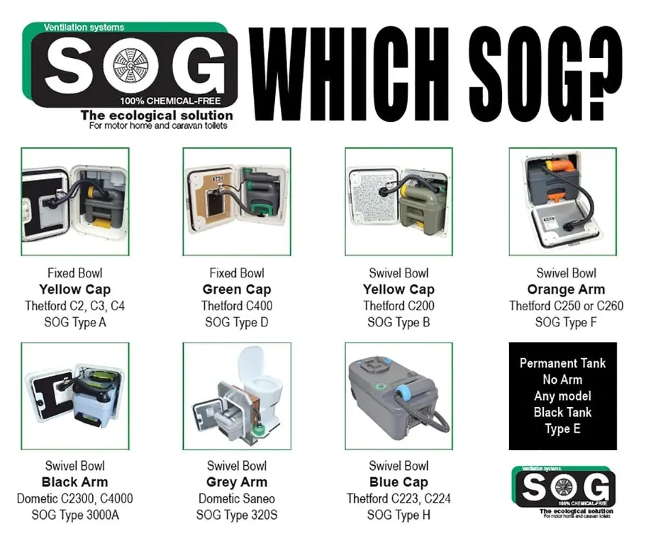 The SOG Toilet Ventilation System is available for all popular 12V Thetford and Dometic cassette toilets as well as for permanent black water tanks.