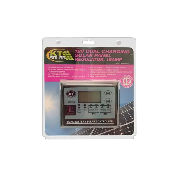 The KT 15 Amp Solar Controller is designed to charge 2 x 12V Deep Cycle Batteries simultaneously. Suited to charge Lead Acid, LTO, Gel, AGM, LiFePO4 & Calcium Battery types, this Solar Charge Controller prevents batteries from becoming overcharged. The unit provides an automatic equalisation feature for deeply drained conventional lead-acid or calcium battery.