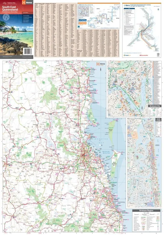 A regional map of South East Queensland (1:500,000) that stretches from the New South Wales-Queensland border to past Bundaberg, with maps of the Brisbane Region (1:300,000), Brisbane City and the Gold Coast on the opposite side.