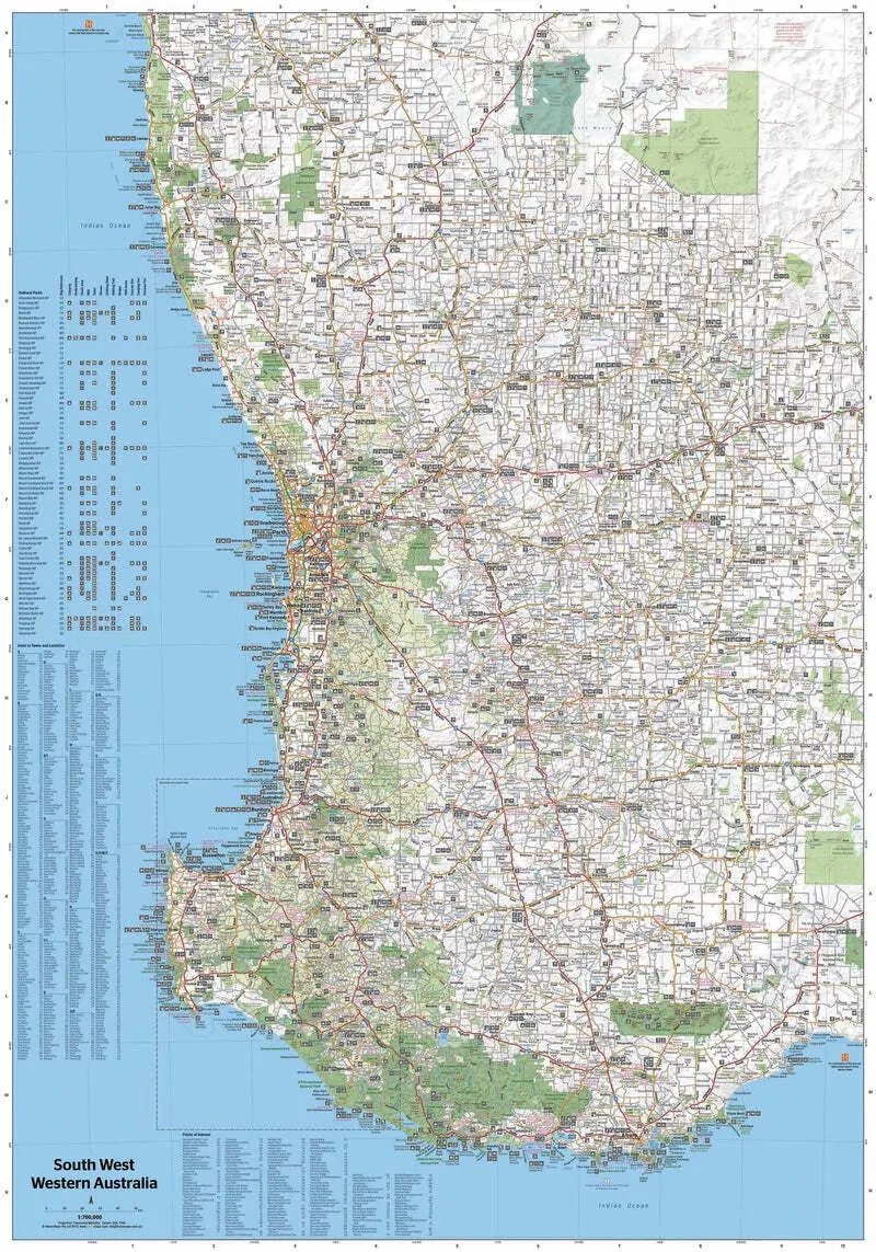 A huge laminated map that features updated mapping of the South West WA region, with numerous points of interest and GPS field-checked 4WD tracks marked on the map. The mapping features 4WD tracks, touring information, points of interest, facilities and distances, making it the perfect trip planning tool and reference map.