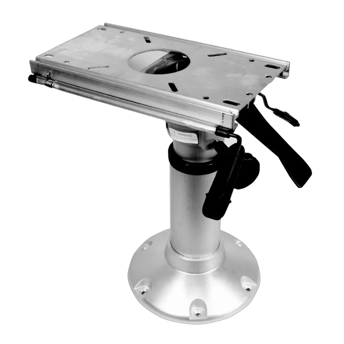 Gas operated adjustable height pedestals incorporating gas suspension ride. Heavy duty, anodised cast alloy base. Instantaneous gas locking height adjustment via a lift lever release and swivel chair slide.