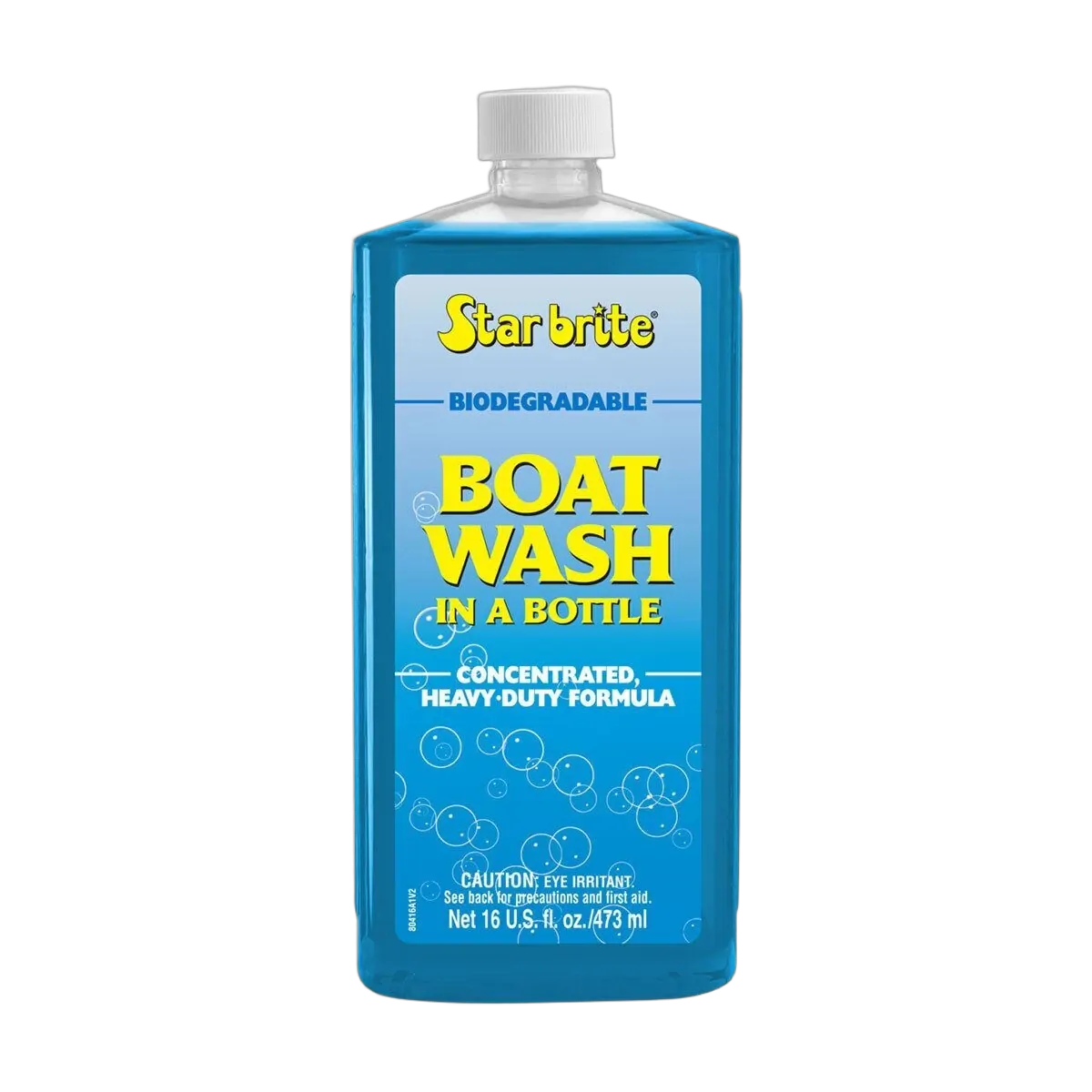 Starbrite Boat Wash in a Bottle is biodegradable, leaves hulls, decks, chrome, and fittings sparkling. Non-streaking - does not leave residue. Concentrated heavy-duty formula. Special cleaning agents remove dirt, fish blood, salt deposits, road grime, exhaust smudges, waterline stains and more. Will not remove wax or polish.