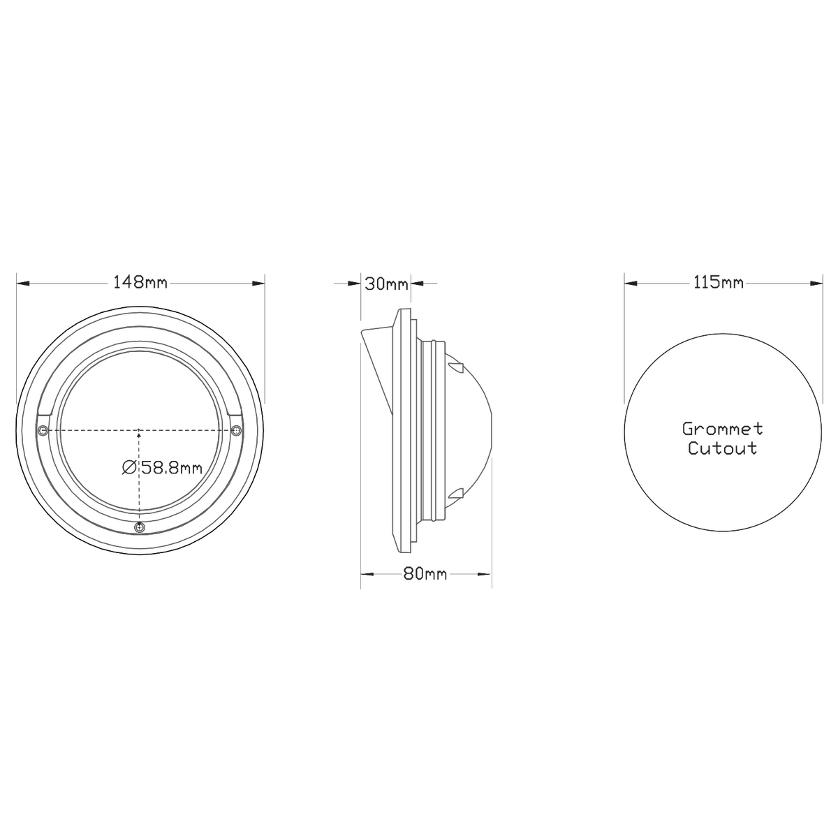 Retro fit to existing 4 inch lamps. If new installation fit grommet or flange into cutout (Cut out 115mm round) plug wire into lamp and run through back then push into grommet/flange. Screw chrome housing with screws supplied. Please refer to ADR 13/00 for mounting instructions.