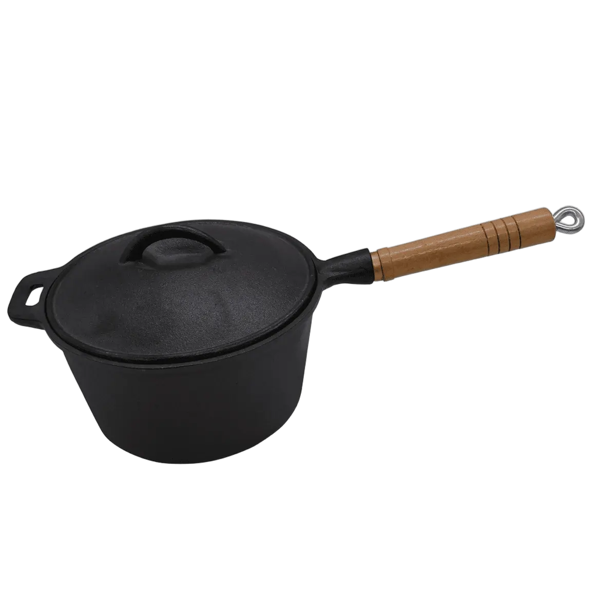 3qt pre-seasoned, cast-iron saucepan with lid and handle.