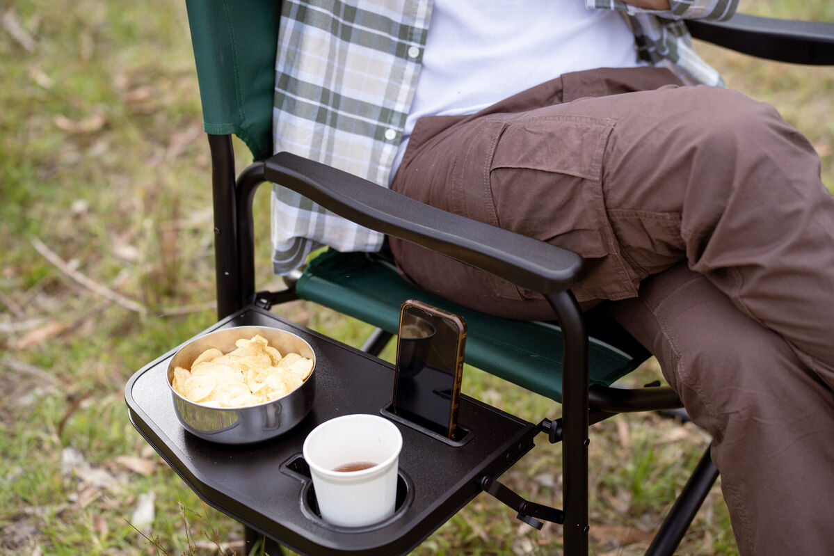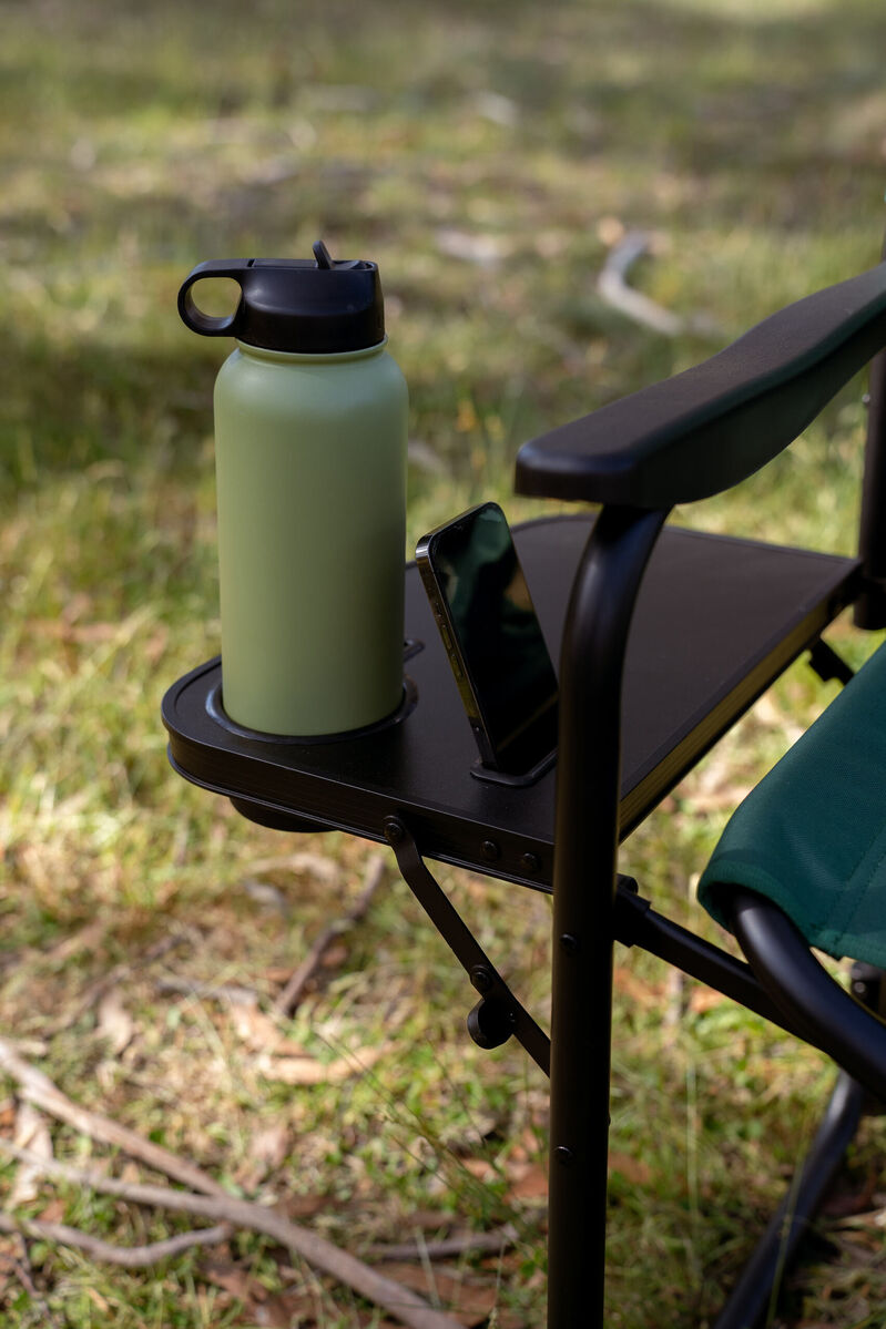 Aluminium directors chair with side table and cup holder.