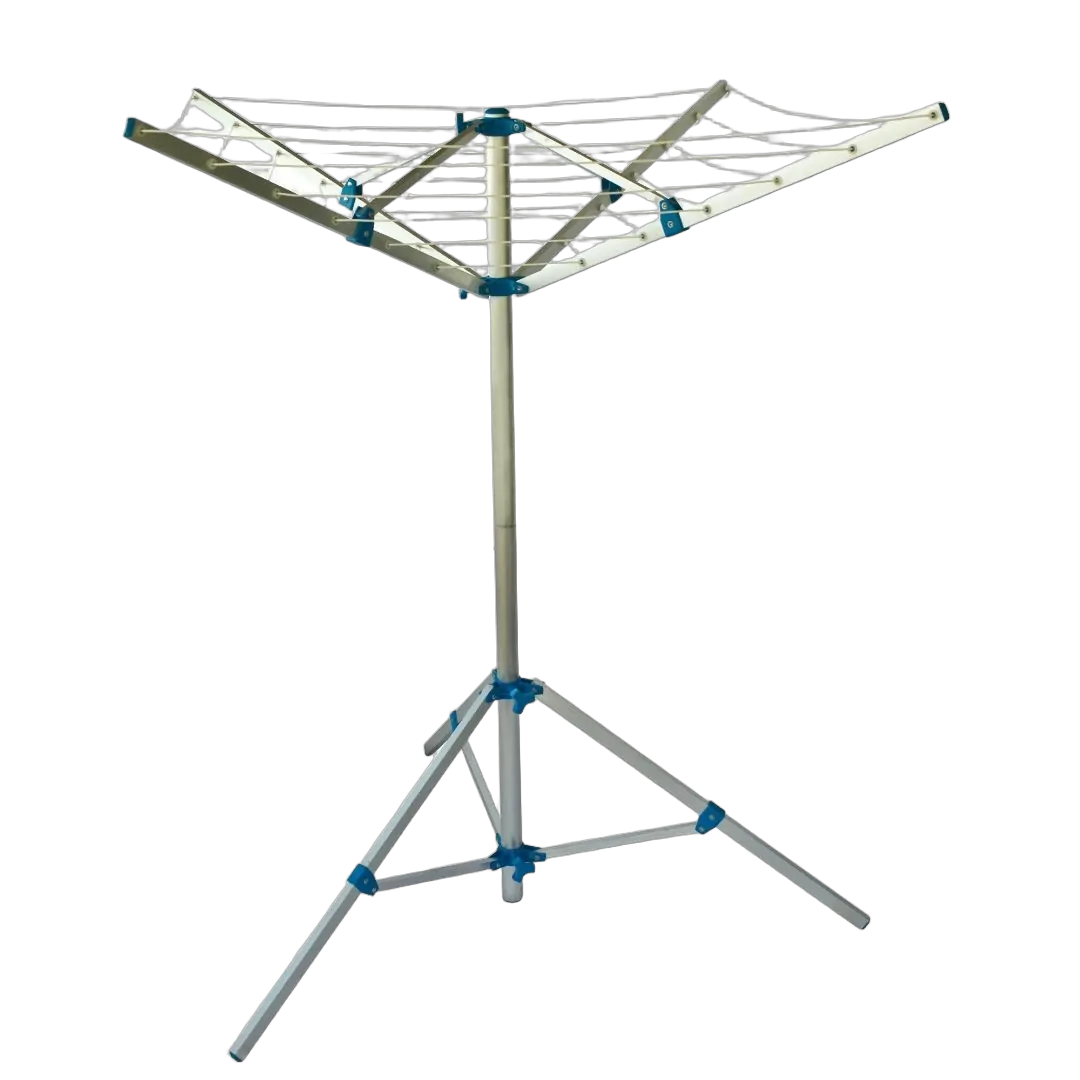 Collapsible multi-purpose clothes airer, umbrella style with tri-leg design for stability.