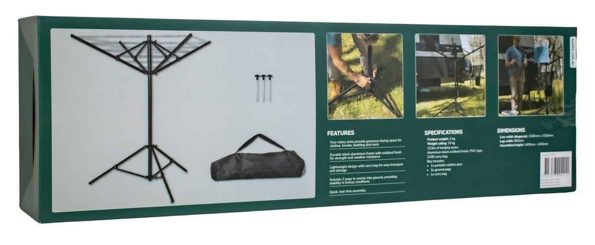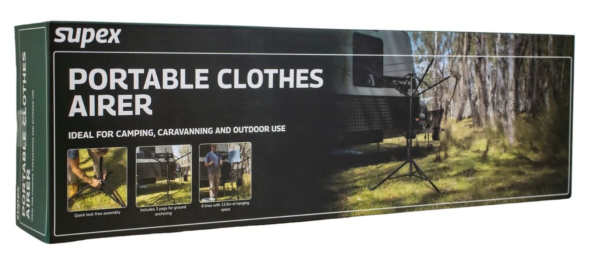 Great clothes hanging solution for drying clothes whilst travelling, especially if you’re unsure if you will be permitted to hang lines between trees at your campsite. Unfold out of carry bag and fasten to the ground for the ultimate drying solution!