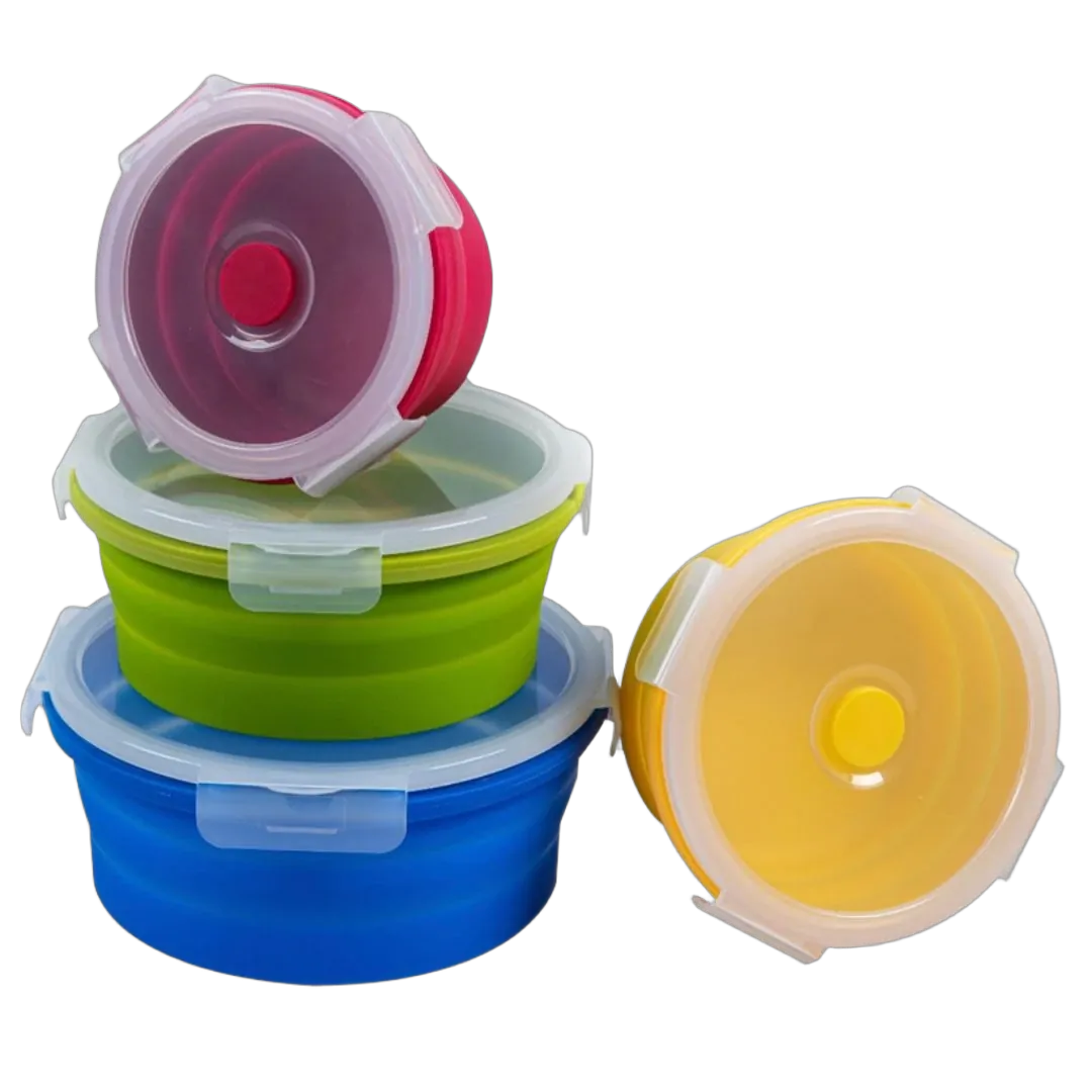 Colorful set of 4 stackable round containers with snap on lids, collapsible design.