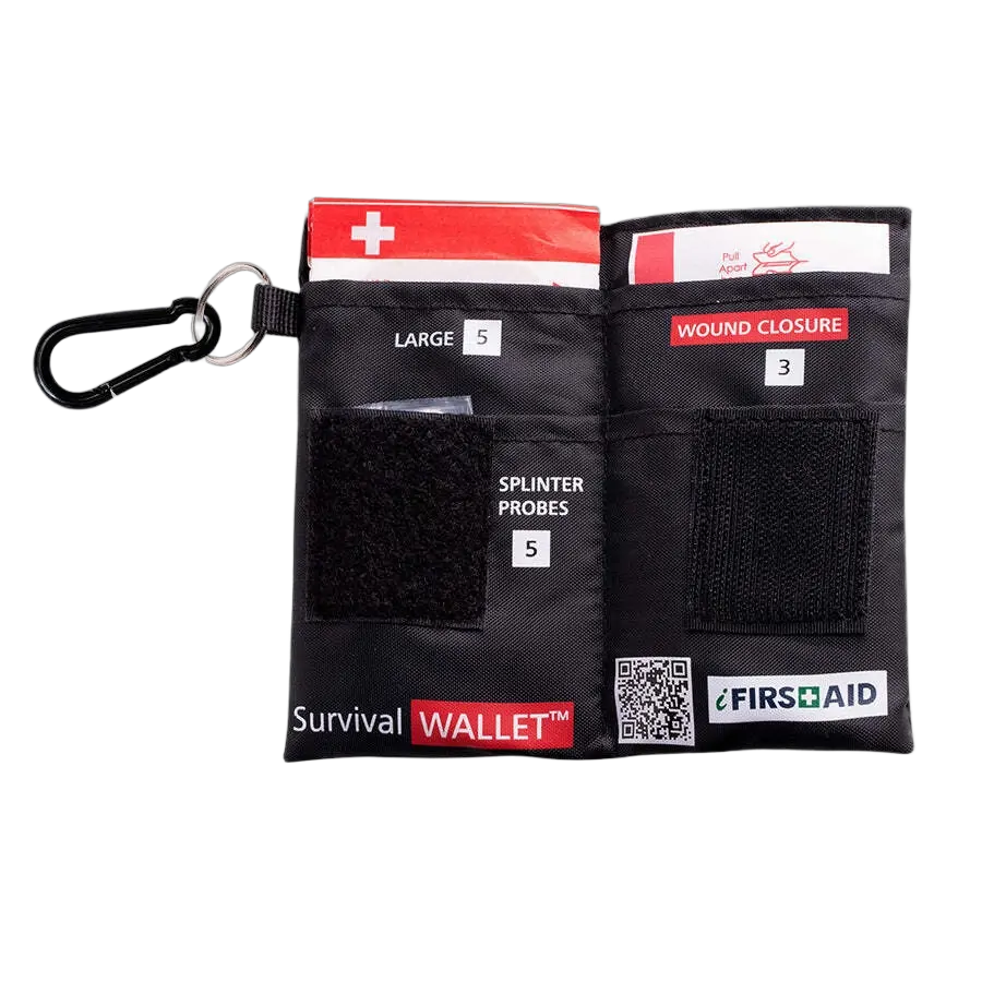The SURVIVAL Wallet™ is a new "Grab & Go" module for when you're out and about. It contains the items you need for those smaller injuries such as cuts, splinters and minor wounds. It is the perfect companion to clip on to your keys, handbag, baby pram, or even attach it to your First Aid KIT.