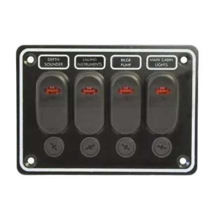 Extremely weather resistant black textured alloy switch panels with LED illuminated rocker switches with weatherproof gaskets.