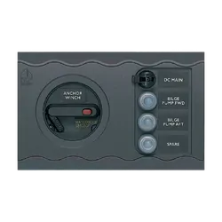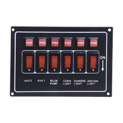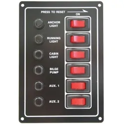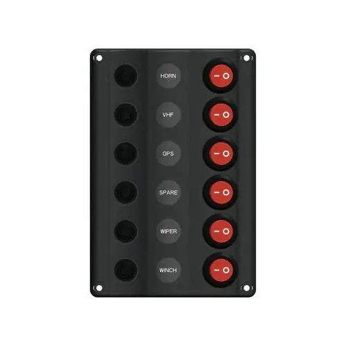 | RWB5823 | 12v switch panel with 6 x switches Circuit breakers - 2 x 5 amp, 2 x 10 amp, 2 x 15 amp Panel size - 160 x 107mm |