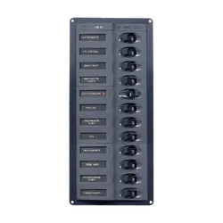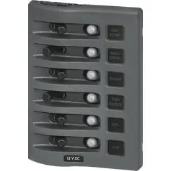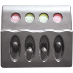 Contoured wave design splashproof switch panels with circuit breakers and rocker switches with LED indicators in a variety of sizes and configurations.