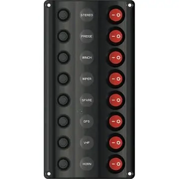 2v switch panel with 8 x switches Circuit breakers - 2 x 5 amp, 3 x 10 amp, 3 x 15 amp Panel size - 210 x 107mm |