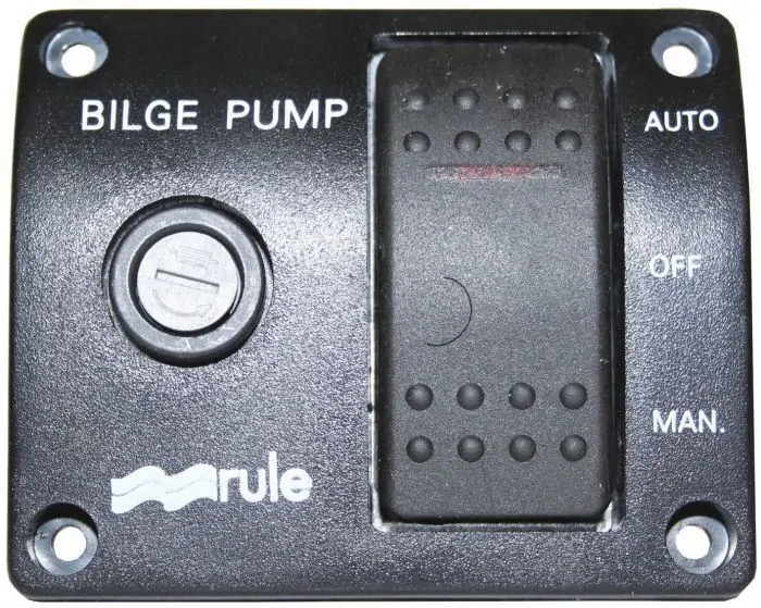 A modern, stylish 3-way rocker panel switch for controlling bilge pump operation. Features a moulded black plastic panel, built-in fuse holder and an internally lit waterproof rocker switch with 3 positions (automatic, off or manual) with Rule's fail-safe "spring return to off" from the manual position.