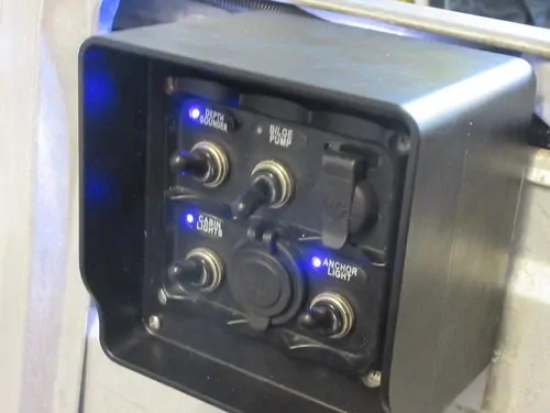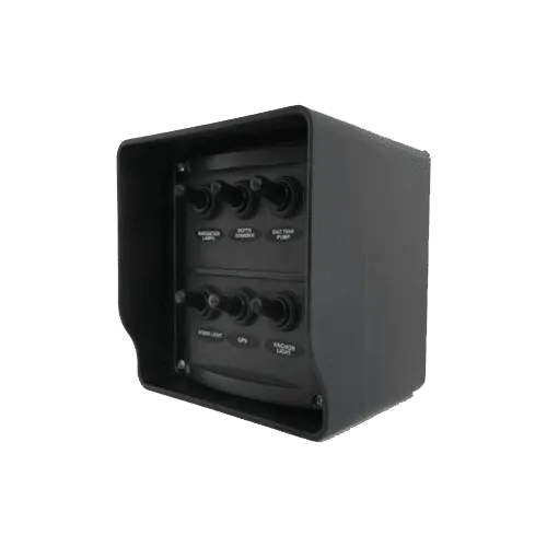 Blank switch panel mounting enclosure . Injection molded in Australia from high quality ASA plastic for superior UV and impact resistance. Radiused corners and shroud. The 3 mm thick walls give greater strength over traditional junction boxes. Flush sides mean it can be mounted in almost any position and is designed for use in open boats, outdoors or industrial applications and able to be customized to fit your switches and gauges. It is designed to be compatible with commonly available water-proof switch panels.The shroud has been designed to help avoid the accidental turning or off of switches by contact with fishing lines , rods , nets etc. It comes supplied with 316 grade marine stainless steel screws and nitrile seal. The front panel with shroud can also be used alone and flush mounted onto consoles or panels if desired.