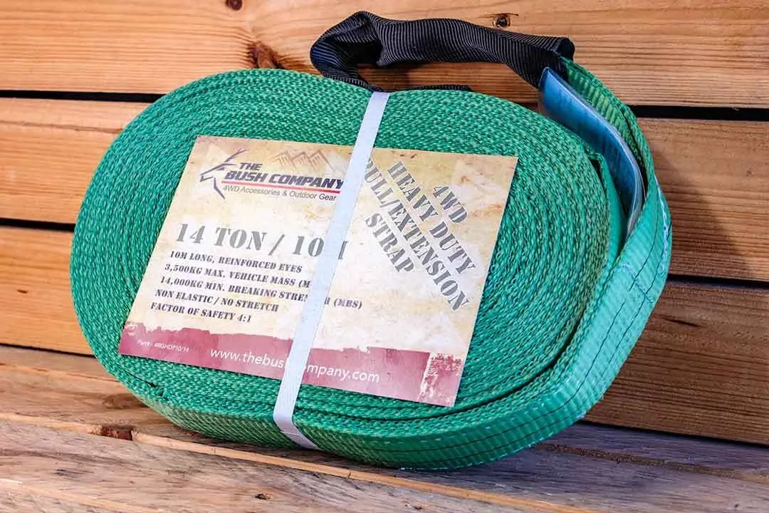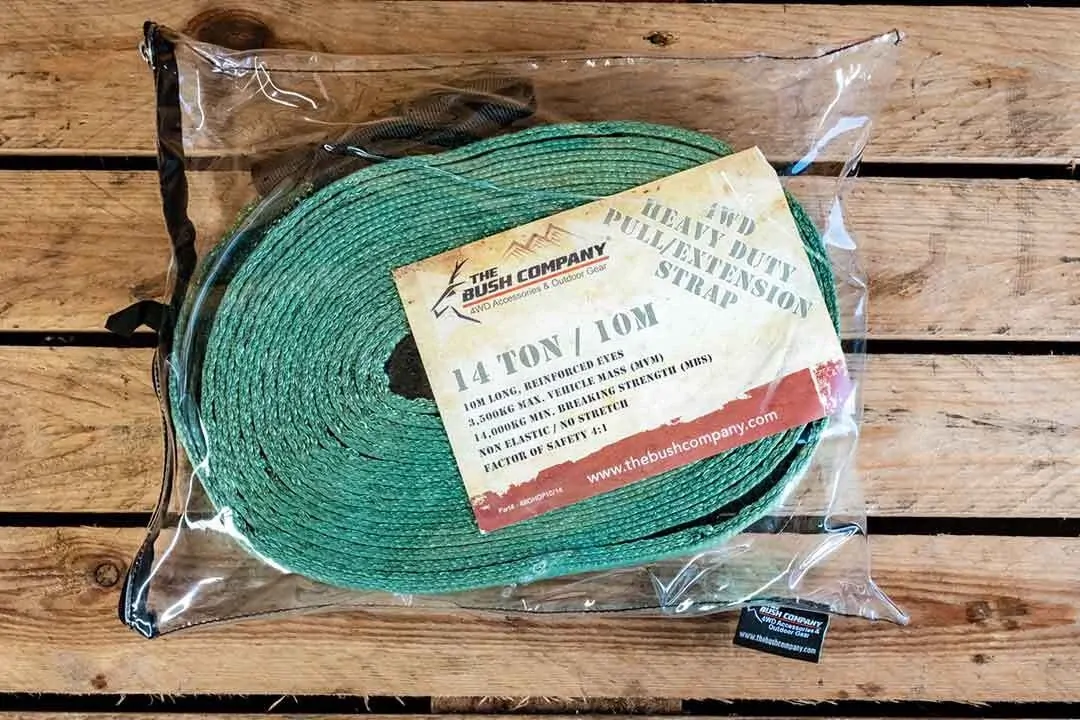 Heavy Duty Pull-Extension Strap 10m 14t has been designed to The Bush Company’s specifications and is a heavy duty non-stretching strap that is perfect for situations when the ideal anchor point for a winch recovery is out of reach or to use as a non kinetic pull strap to extend a kinetic strap. Reinforced and sheathed end loops provide additional protection.