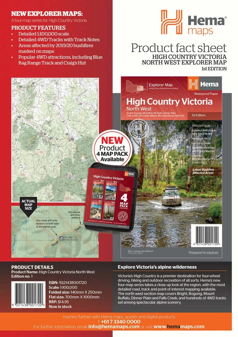 This map is part of Hema's new Victorian High Country Map Series and covers the North-Western Alps Area. It overlooks Hotham, Wangaratta and surrounds including Bright, Bogong, Mount Buffalo, Dinner Plain and Falls Creek along with hundreds of 4WD tracks set among spectacular alpine scenery. Printed on durable waterproof paper, this map features Hema's iconic mapping and extensive points of interest.