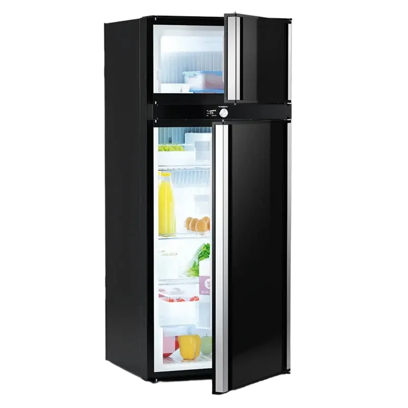 A large, 175L double-door absorption refrigerator that constantly stays cool. This model with LED control panel guarantees a cabinet temperature that is always perfect regardless the power supply (between 210 and 250V). The desired energy source is selected automatically for this refrigerator.