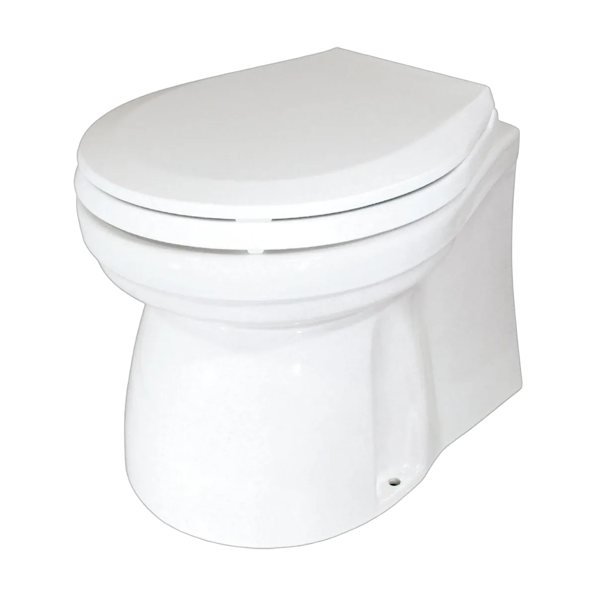 This Euro styled toilet has large bowl sizing but in a lower profile (medium height). Fully enclosed motor and plumbing connections, protects motor and is easy to clean.