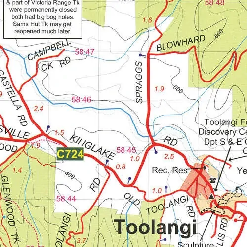 A double-sided map that includes Alexandra, Narbethong, Buxton, Cobaw, Lancefield, Macedon and Romsey, as well as Cobaw State Forest, Tallarook State Forest, Mount Disappointment State Forest, Toolangi State Forest, Black Range, Kinglake National Park, Healesville, Murrindindi, Yea, Highlands, and Seymour. The other side of the map is a detailed scale map of both the Kinglake National Park and the Cobaw Ranges, complete with forest activities information.