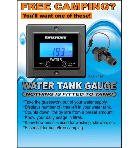 Ever wondered, "Have I got enough water to stay another one or two days?". When free camping, we all know the importance of keeping track of exactly how much water is left in your tanks.Our new H2F-FM Water Tank Gauge now features a larger backlit screen that actually shows the number of litres remaining in your tank, rather than the traditional full/half/empty display.This makes it easy to know your average daily water usage and to help plan your next adventure.The good news is the sender is fitted in the hose line and there is nothing fitted to the tank.We now have two exclusive RV & marine models, one suited more to the DIY aftermarket H2F-SM and our new flush mount H2F-FM designed to provide a superior appearance to more closely match the other displays in new RVs and boats.