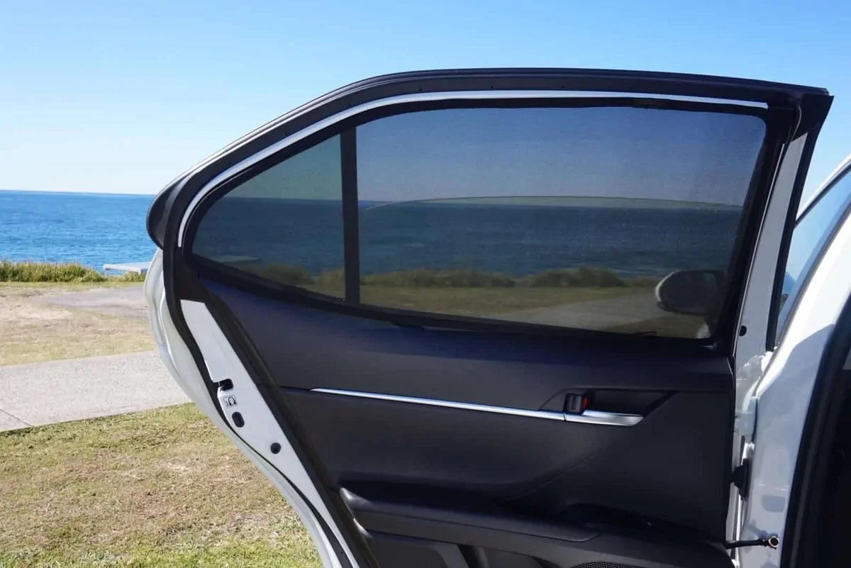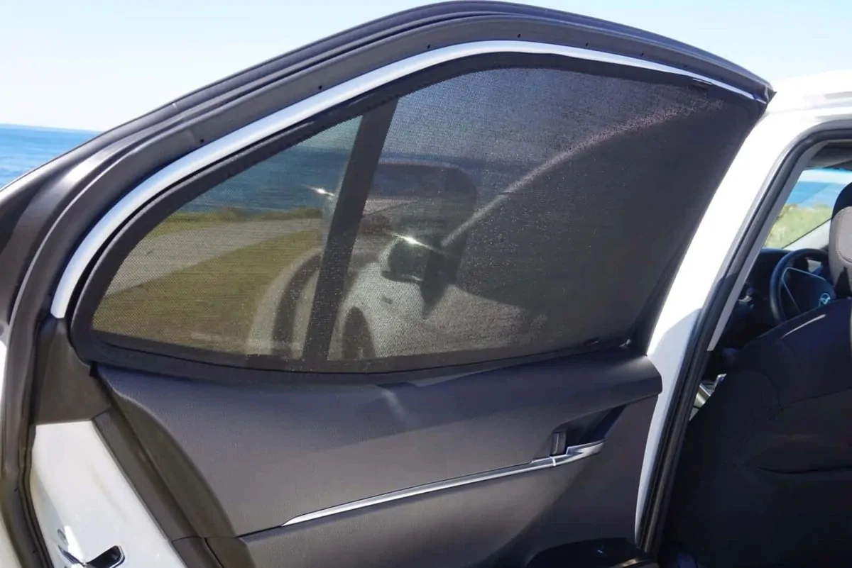 Note: Our custom sun shades block out a significant amount of light and UV rays that enter from the front windscreen, however due to the angle of the front windscreen and additional sensors or different mirror shapes/sizes available for different models, there may be slight gaps around your rear-view mirror or sides to allow the sun shade to fit.