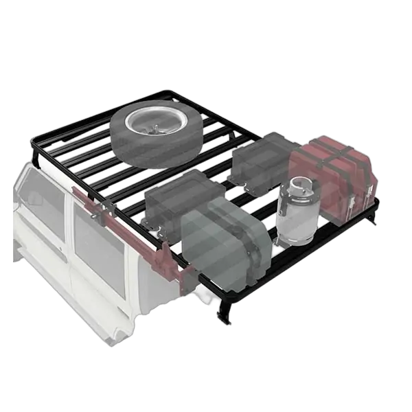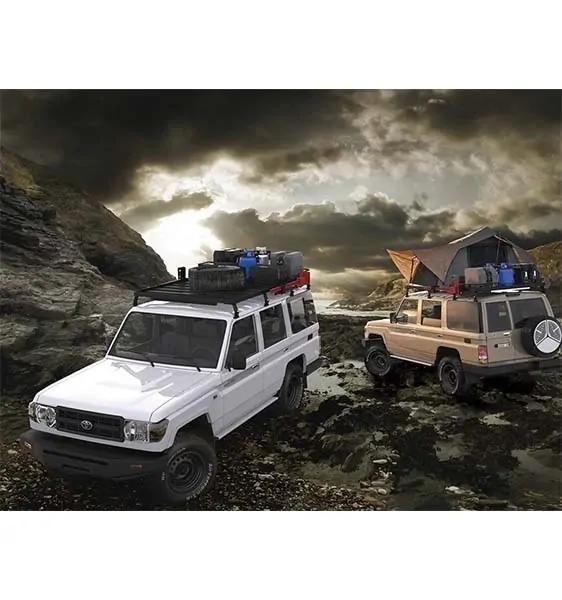 This 2368mm/93.2" long full-size Slimline II cargo carrying roof rack kit for the Toyota Land Cruiser 70 contains Slimline II Tray and Wind Deflector, as well as 8 Gutter Mount legs for mounting the Tray to the vehicle. It installs easily with no drilling required.
