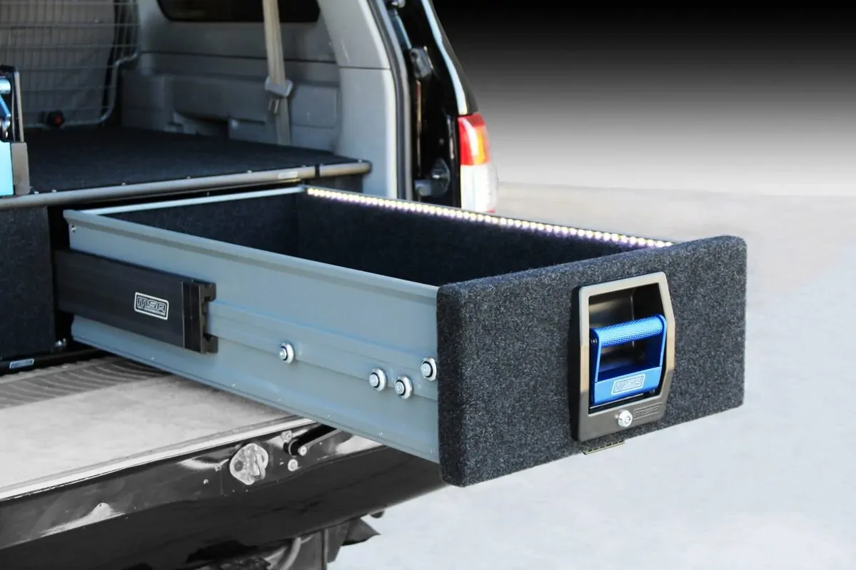 One of the lightest drawer systems ever made, the ADR Crash Test Certified MSA 4X4 Explorer Aluminium Storage Drawer System boasts more storage space than most other systems with the same outside dimensions! Patented “Pro-Glide technology smoothly handles up to 250kg per pair of drawers providing smooth opening under heavy loads as well as 100% drawer extension and access. The entire drawer comes out further than the frame! No hard to reach items in our drawers and no unpacking of contents to reach items at the back!