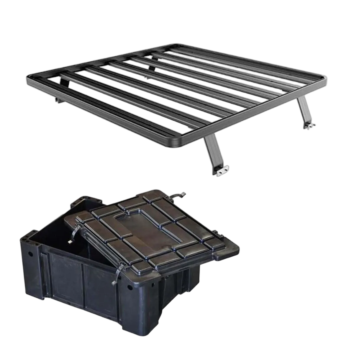 This kit creates a full size rack that sits above your Toyota Tacoma’s (2005 + w/OEM bed rails) load bed. This Slimline II cargo carrying rack kit contains the Slimline II tray (1425mm/56.1" (W) x 1358mm/53.5" (L)) and 4 Pick-Up Truck Bed Universal Legs that fit into the existing factory/OEM bed tracks.