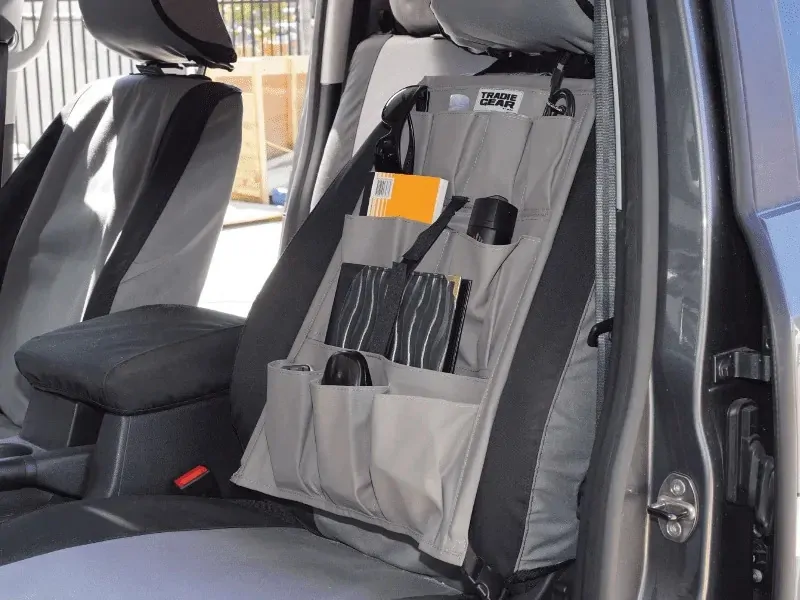 Tradie Gear TGORGS Seat Organiser. Offering 12 individual pockets for endless storage possibilities including 3 larger pockets for street directories, maps, order pads, invoice books & iPads. Manufactured from heavy duty 14oz canvas, with an aluminium internal frame that prevents sagging even when full.