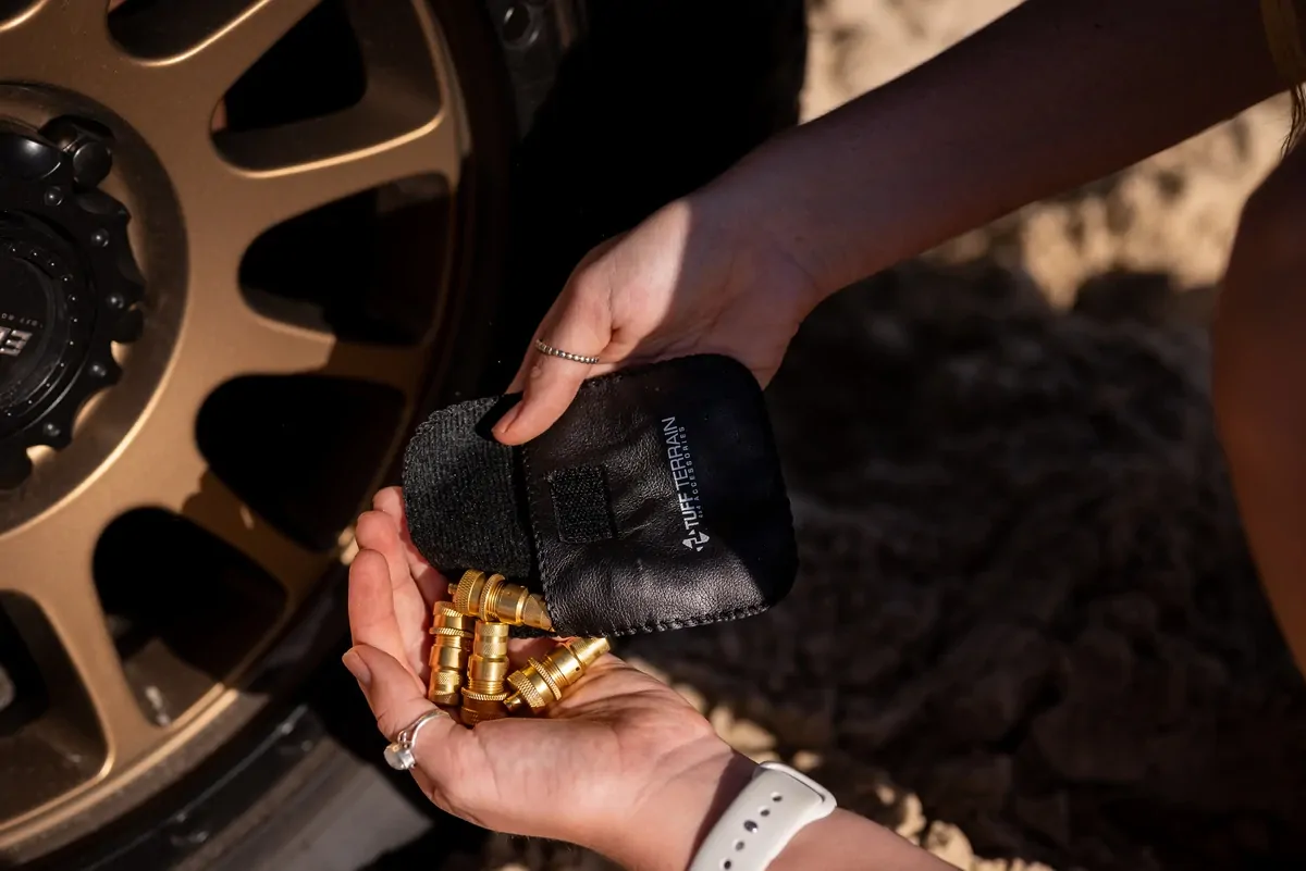 Hand operated brass universal tyre deflators - no need for tools or deflators to air down. Let's say you want to set your tyres to 18 psi before you hit the beach. Before leaving home, using a pressure gauge you air out to 18 psi, screw these on, undo the top cap enough that it just starts to let air out, then go back just enough that it stops and locks the setting into place. This "sets" them to 18 PSI. Next time you're at the beach all you have to do is screw them on and they air down to 18 psi for you, just throw all four on and deflate in minutes. Remove them and screw the air caps back on before driving. Simple, time saving, easy.