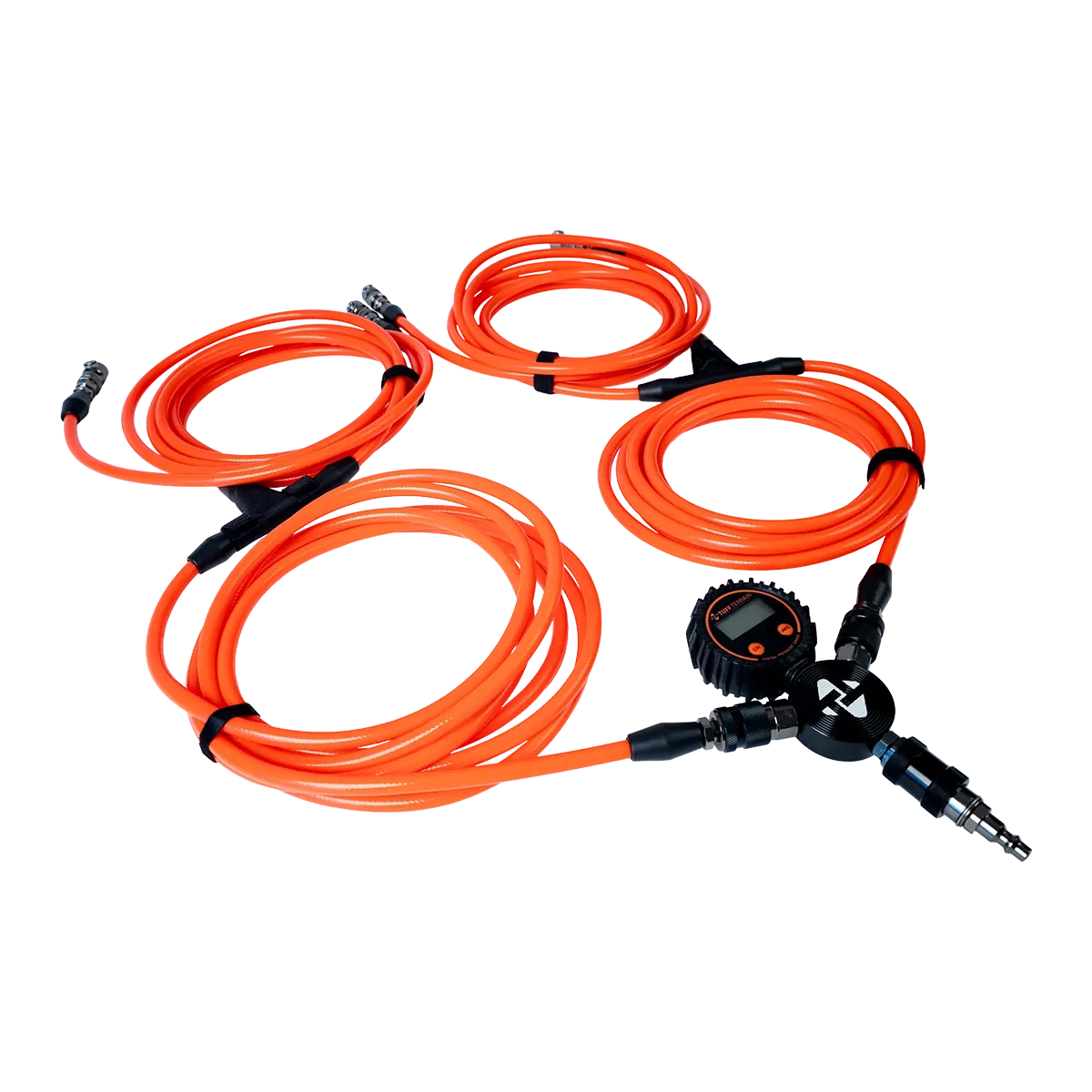 Deflating is just as easy. Connect the fittings to each tire valve and position the gauge. Open the ball valve to release air from all the tires at once. The pressure will drop evenly, and you can keep an eye on the display to get it just right. When you’ve reached the PSI you need, close the valve and unhook the fittings. Pack everything into the vented storage bag, and you’re ready to hit the tracks or the road.