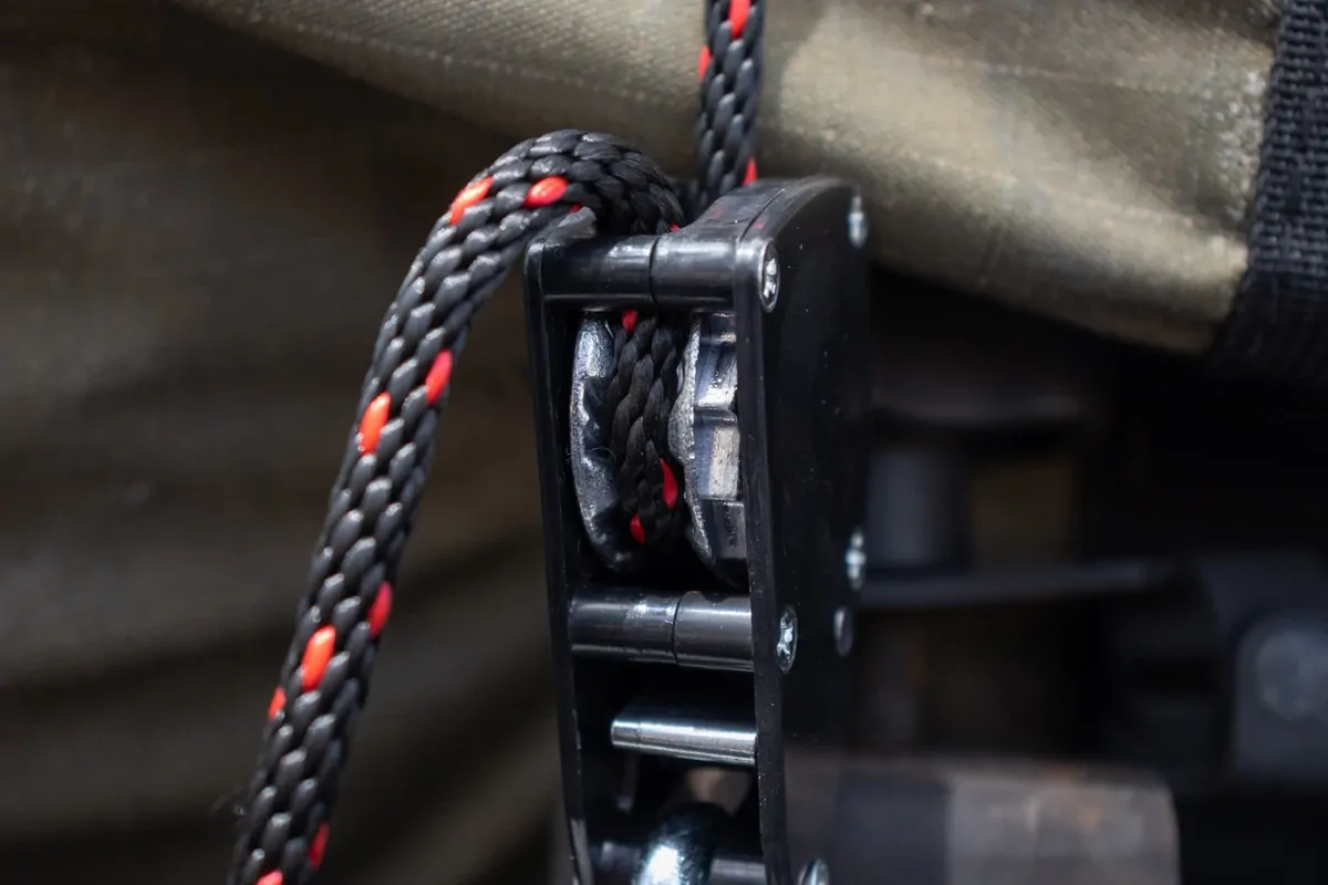 Letting the rope loose is just as quick. Press the release button on the ratchet and the lock will let go. Then pull the rope back through to loosen or remove it.