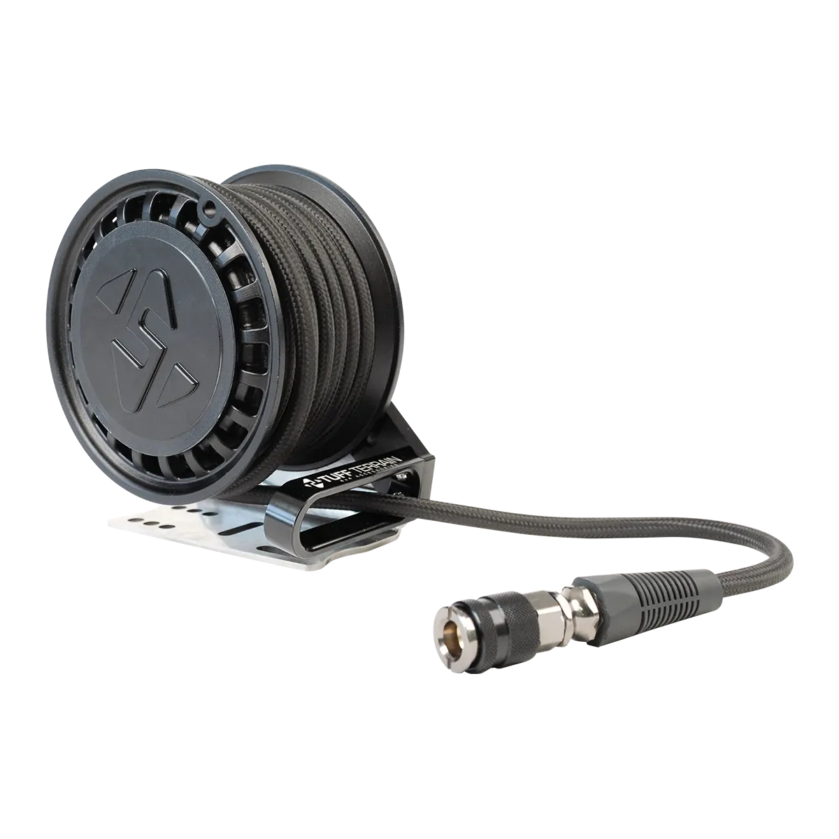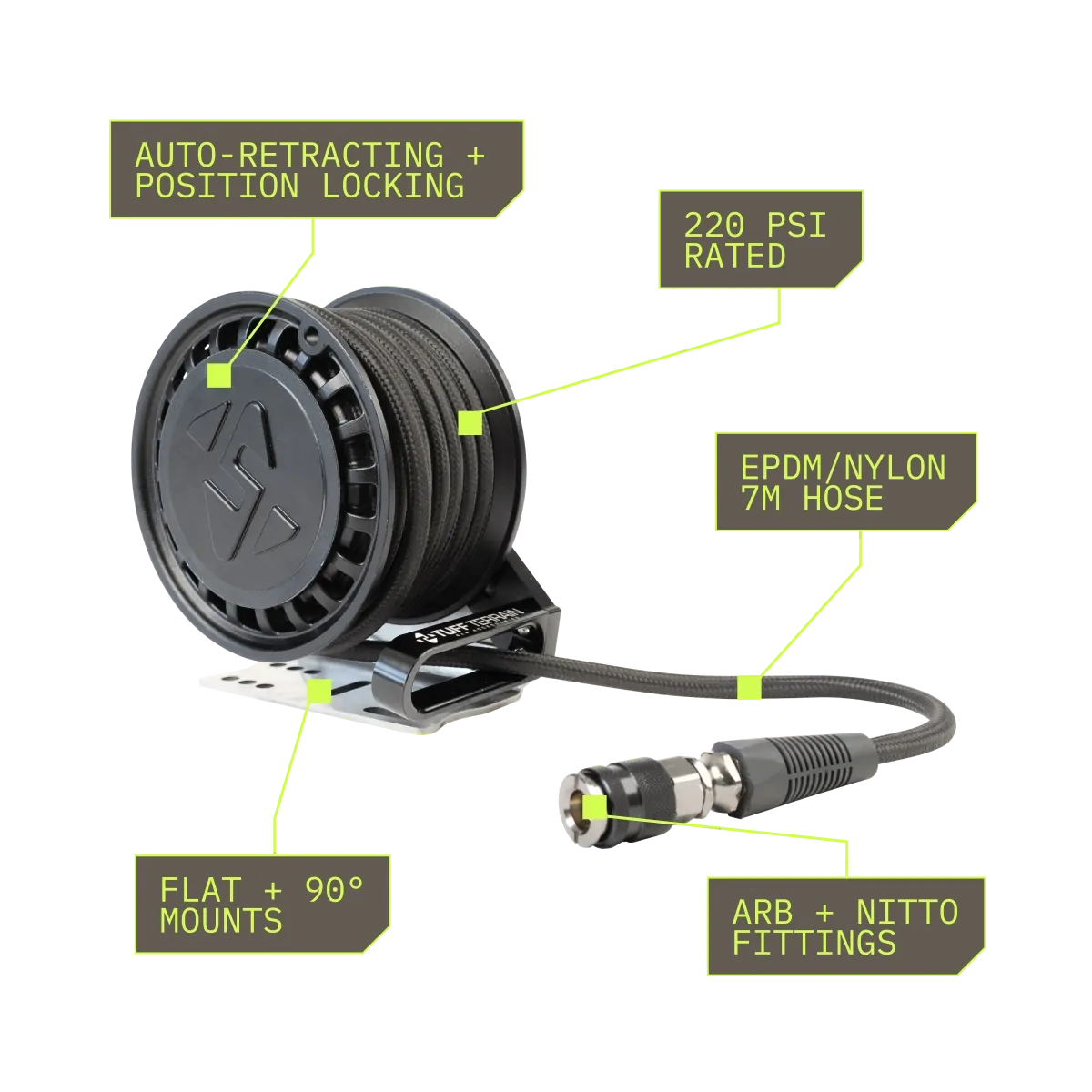 This is the world's first auto-retracting air hose reel built into a compact frame. It’s designed for serious use in 4WDs, trailers, canopies, service vehicles or even the workshop where space is limited but performance can't be compromised. The spring-loaded retraction system pulls the hose back in smoothly without any winding or fuss.