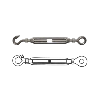 316 grade stainless steel with a hook on one end and an eye on the other end. Metric thread with lock nuts.
